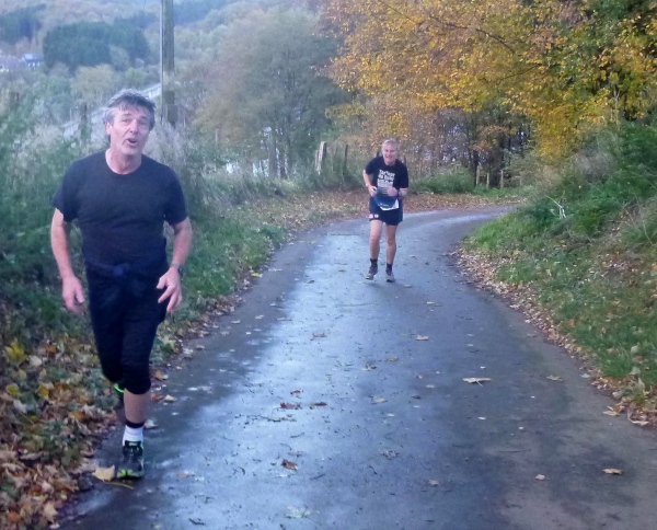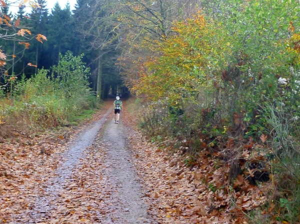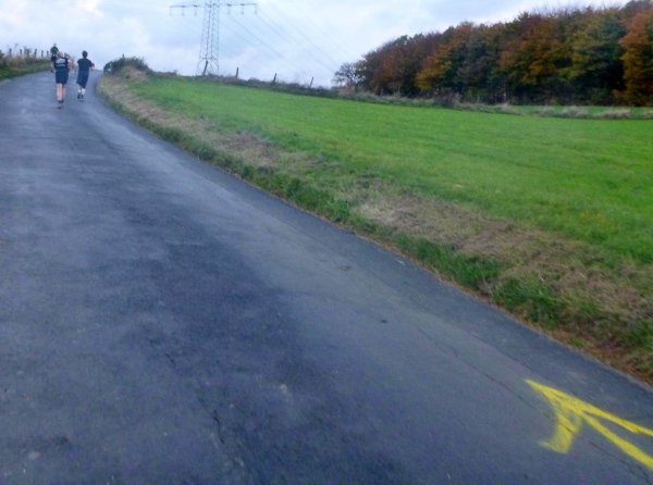 Nach diesem optischen Highlight und dem Fehlen der vielen Halbmarathonis wird es ruhig auf der Strecke. Es geht wellig auf und ab. Immer wieder werden kleine Taleinschnitte mitgenommen. Manche Steigungen spürt man nur, weil die Beine schwerer werden. So wechsele ich ständig zwischen Laufen und Gehen. Auch die anderen haben ihren Rhythmus und so überholt man immer dieselben. Alle 5 km steht ein Kilometerhinweis.