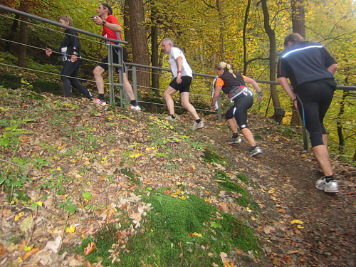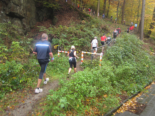 Nach etwa 4 bis 5 Kilometer durch die Altstadt geht es rauf und runter und tatsächlich ist das Bergische Land genauso bergig, wie der Name verspricht. Mit insgesamt 540 Höhenmeter bergauf und 650 Höhenmeter bergab ist der Marathon ausgeschrieben. Jetzt wird sich zeigen, ob nach den vielen Wochen, die seit unserem letzten Berg(ischen) Läufen vergangen sind, noch Mukis in den Oberschenkeln stecken. Die Trail-Schuhe freuen sich endlich wieder Matsch unter dem Profil zu haben. Wohl völlig anders zur gleichen Zeit beim Frankfurt Marathon. Da schieben sich vermutlich tausende von Läuferschuh-Modellen durch eine hingeworfene Becherflut und die Sohle klebt auf dem isotonisch getränkten Asphalt.