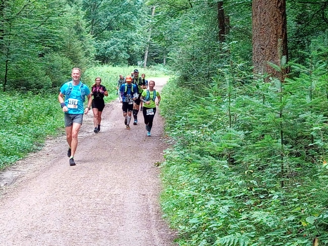 An den Absperrgittern längs und in den Wald. Nur kurz, dann durch den einzigen Ort, aber mehr so am Rand. Da ist tatsächlich etwas Asphalt unter den Tretern, aber dann folgt Waldboden, Schotter und Sand pur, gespickt mit Wurzeln und Steinen, immer vom Feinsten. Noch ist es trocken, meine ersten 3 Stunden sind einfach perfekt. Kühle Temperatur, leichter Wind, etwas Sonne. Später beginnt ein Nieselregen, den ich als willkommene Erfrischung einsortiere, kein Grund für die Regenjacke. Nass bin ich ja sowieso, also was soll‘s. Aber die Posten tun mir leid, am VP oder an Schlüsselstellen im Gelände. Aber alle sind gut drauf und haben engagiert einen tollen Job gemacht. Elf Verpflegungsstationen, 45 Streckenposten, sechs Sanitätsposten. Leute - meinen Dank dafür, ohne euch geht sowas nicht!
