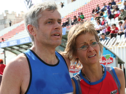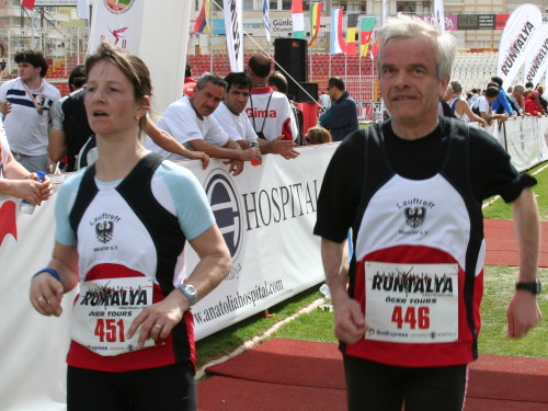 Das darf doch nicht wahr sein. Vor mir sehe ein Läuferpaar, das ich sofort erkenne. Es ist Martina aus Lübeck und Alfred aus Essen. Was so unglaublich ist, ist der Ort. An fast genau der gleichen Stelle habe ich sie auch letztes Jahr überholt und fotografiert, als sie mitten auf der Strecke am Knutschen waren. Logisch, für ein Foto machen sie das heute wieder.