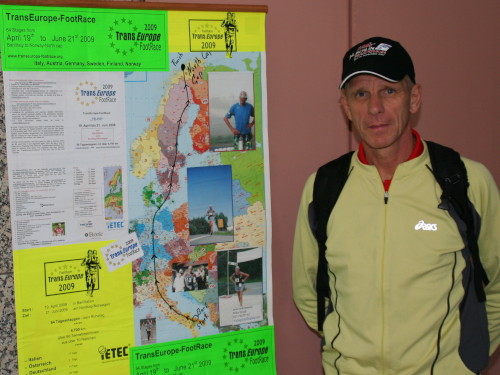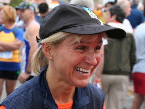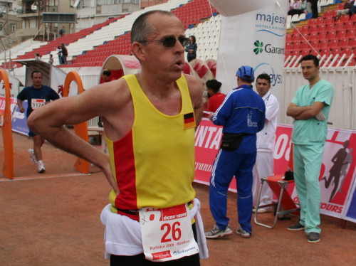 Ich gebe meine Klamotten rechtzeitig ab, denn kalt ist es trotzdem nicht. So entgehe ich auch einem eventuellen Gedränge in den engen Gängen des Stadiongebäudes. Jetzt kann ich ungestört die Atmosphäre genießen. Ich will auch unbedingt Monika treffen, die ich gestern in der Pyramide leider verpasst habe. Sie hat beim m4y-Voting „Marathon des Jahres 2007“ den Hauptpreis gewonnen. Die hübsche Blonde ist an ihrer m4y-Mütze leicht zu erkennen. Ihre Nervosität ist kaum geringer, als die der vielen Einheimischen, die wenig Erfahrung mit solchen Veranstaltungen haben und nur dauernd hin und her rennen. Na ja, bei ihr ist es ja auch erst der Zweite. Bevor sie mit dem Laufen begann, spielte sie ziemlich erfolgreich Tennis.
