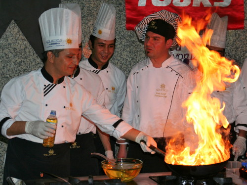 Schon bevor die Kochelite der Gül-Hotels mit einem Flambierfeuerwerk das Buffet eröffnet, haben sich vor den Nudel- und Soßenköstlichkeiten lange Schlangen gebildet. Der Veranstalter meint des mit der Vielfalt und der Selbstbedienung gut. Weil aber keiner auch nur eine Variation auslassen will, ist Geduld gefordert. Langweilig wird es den Wartenden nicht. Die Begrüßungsreden und die Vorstellung der Sponsoren verkürzen die Zeit. Und letztlich ist an vielen zufriedenen und glücklichen Minen abzulesen: die Warterei hat sich gelohnt.