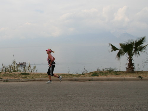 Schon nach 10 Minuten erreichen wir die Steilküste und haben einen wundervollen Ausblick auf das Meer und die Bucht von Antalya – die schneebedeckten Taurusberge sind nur andeutungsweise im Dunst zu erkennen. Schade. Die komplett gesperrte Straße führt jetzt direkt der Küste entlang. Links reiht sich ein Wohnturm an den anderen, rechts sind Parks und Grünlagen mit Palmen, Orangenbäumen und blühenden Sträuchern, dahinter das blaue Meer. Frühsportler gehen spazieren, walken, joggen oder quälen sich an den öffentlichen Trimmgeräten. Manchmal gibt es bewundernde Blicke für die Marathonis und manchmal einen Gruß und Applaus.