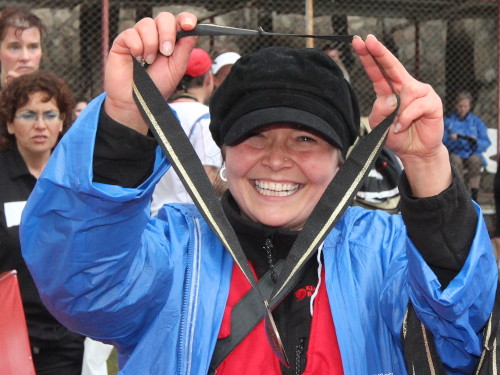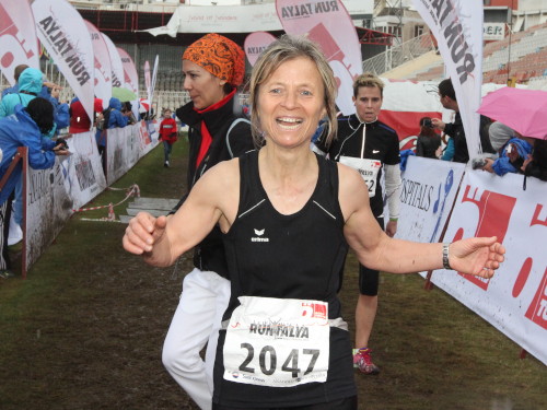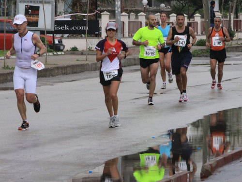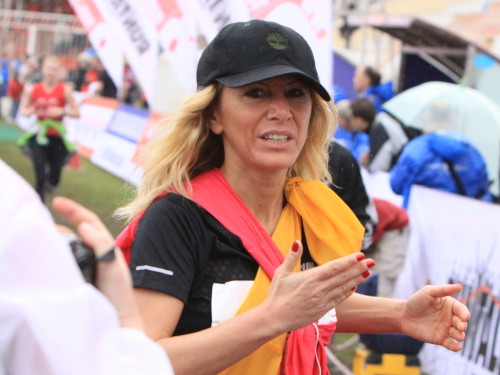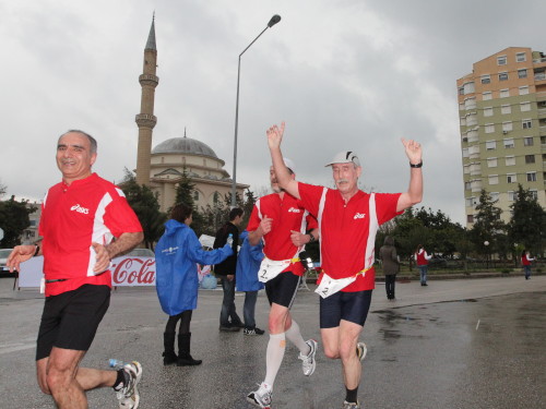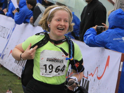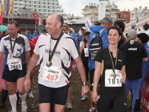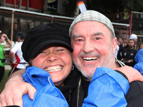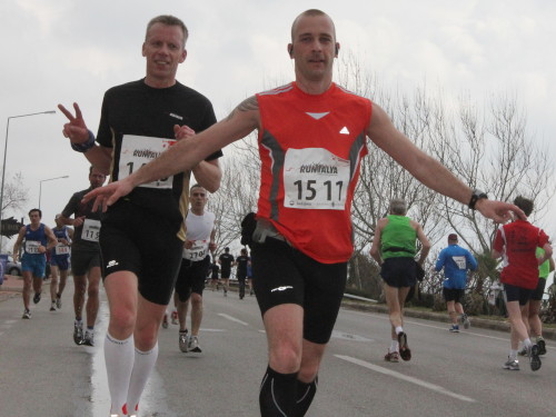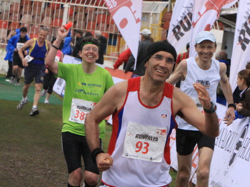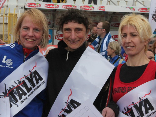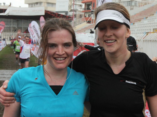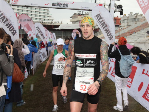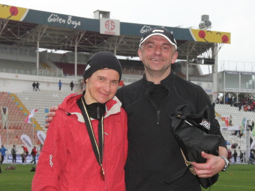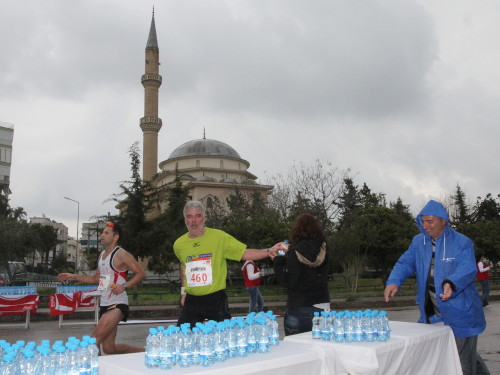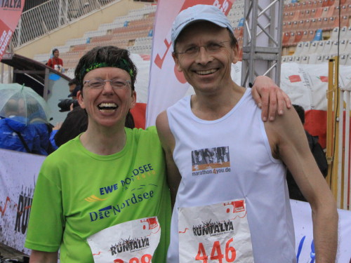 Mit Cola versuche ich legales Zuckerdoping zu betreiben, aber irgendwie will die Lauflust selbst damit nicht mehr recht in Gang kommen. Nicht unbedingt motivationsfördernd ist in dieser Situation zudem, dass Kilometerschilder nur recht sporadisch aufgestellt sind und ich so keine rechte Vorstellung habe, wie lange ich noch durchhalten muss. Was die Cola nicht schafft, das gelingt aber dann Martina Ramthun: Die mich in meinem Elend erblickende Autorenkollegin vom Laufmagazin RUNNING erbarmt sich meiner und nimmt mich - Widerspruch zwecklos - ab km 40 munter schnatternd ins Schlepptau. Und siehe da: Meine Beine laufen wieder, auch wenn es im Kopf anders ausschaut. So verschafft sie mir ein für mein Ego doch noch einigermaßen versöhnliches Finale. Die letzten Meter über das im Morast versinkende Grün des Atatürk Stadions laufen wir Seite an Seite. Danke, Martina.