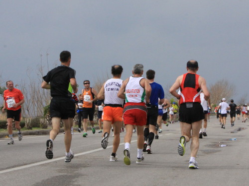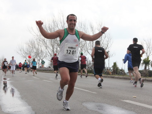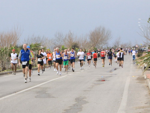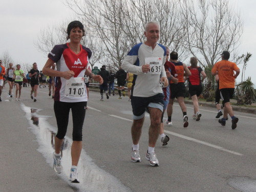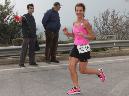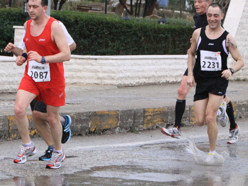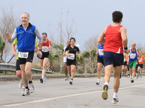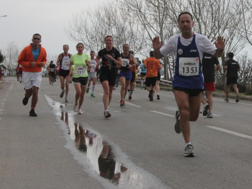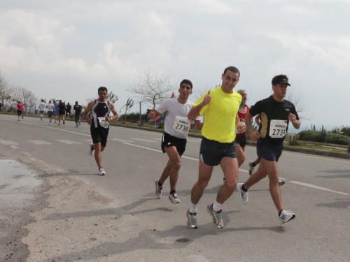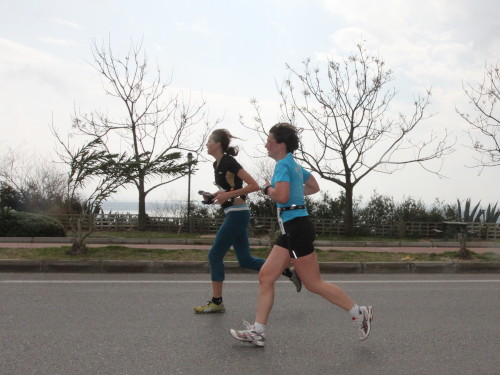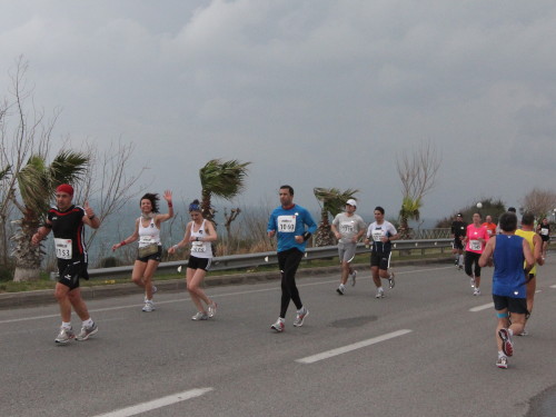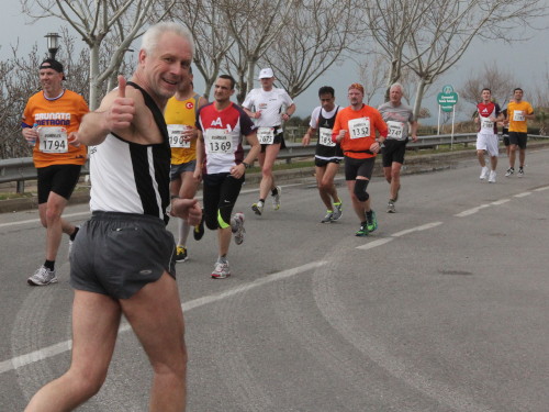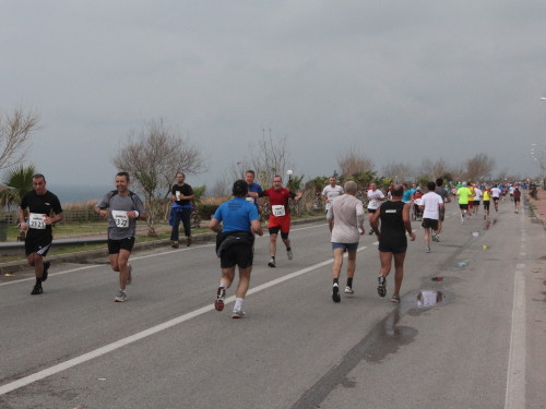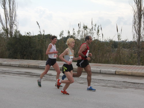 Auf den folgenden Kilometern heißt es: Durchbeißen. Der Läuferpulk hat sich weit auseinander gezogen. Es ist still. Schnurgerade führt die Strecke durch eine beschauliche, aber optisch doch auch ein wenig reizarme Landschaft. Der Schlenker zum Meer entfällt, stattdessen durchmisst unser Kurs nun das Landesinnere. Als zusätzliche Herausforderung geht es zwischen km 31 und 33 leicht, aber beständig bergan. Mein winterliches Trainingsdefizit macht mir zusehends zu schaffen. Das letzte, recht steil nach Lara hinauf führende Streckenstück geht mehr an meine Reserven als mir lieb ist. Danach bin ich “platt” und schleiche nur noch so dahin.