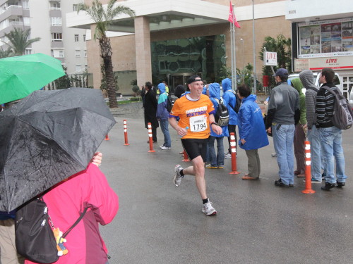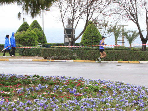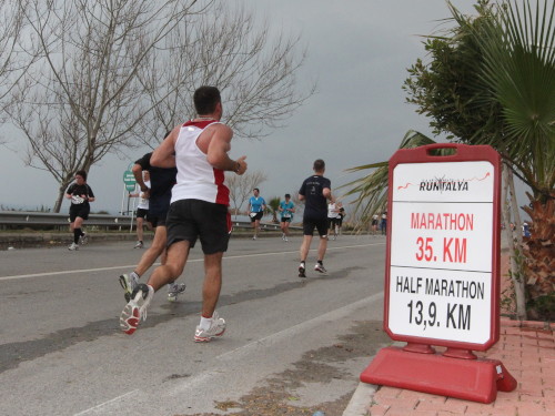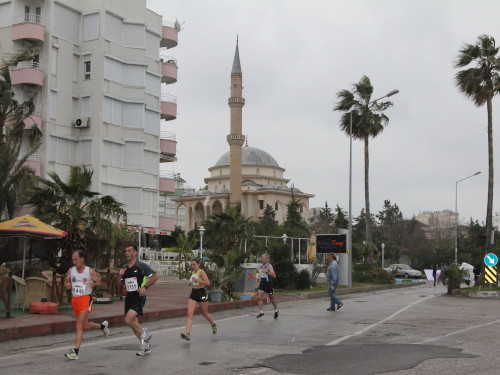 Bei km 34 wird es plötzlich wieder lebendig auf der Laufstrecke. Hier stoßen die zeitversetzt um 10:30 Uhr gestarteten Halbmarathon-Läufer nach ihrem Streckenwendepunkt auf das Marathonfeld. Weiter geht es auf der mir schon vom Hinweg bekannten Strecke: im Slalom durch die Hochhäuser, über den Düden, an der Steilküste entlang, immer weiter in die Stadt hinein. Nach dem Sonnenintermezzo in Lara Beach / Kundu hat sich der Himmel, passend zu meiner läuferischen Grundstimmung, wieder eingetrübt, Sprühregen stimmt uns auf Ärgeres ein. Auch nimmt der Wind wieder an Fahrt auf, wenn auch nicht mehr als permanenter Gegenwind wie auf der ersten Streckenhälfte.