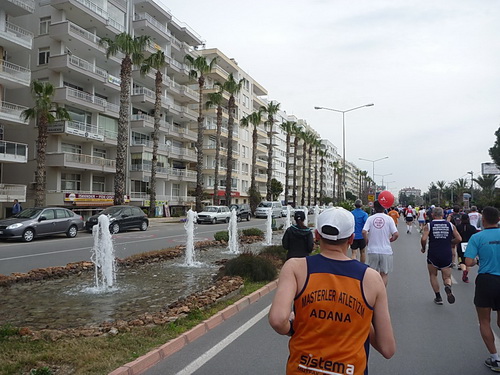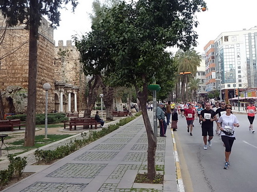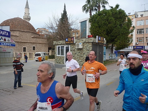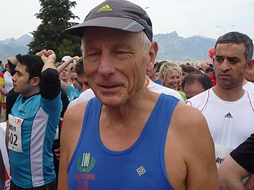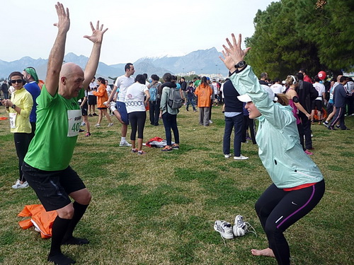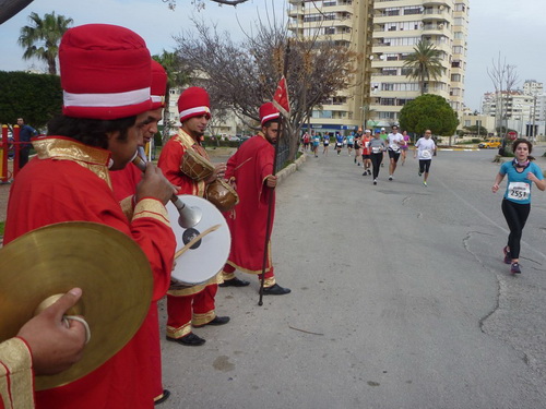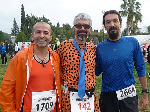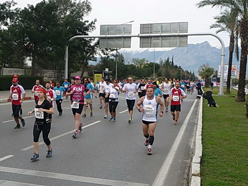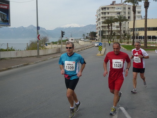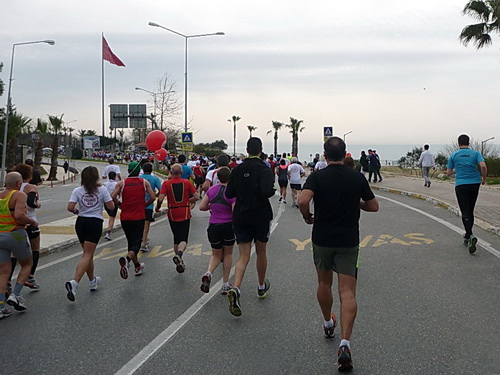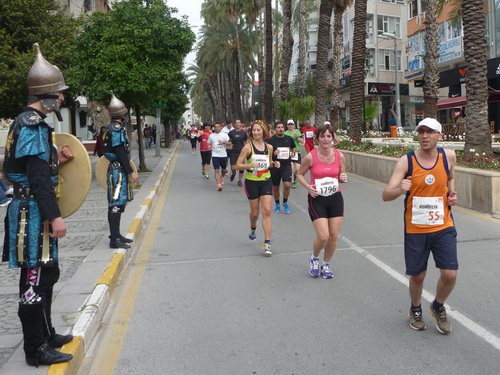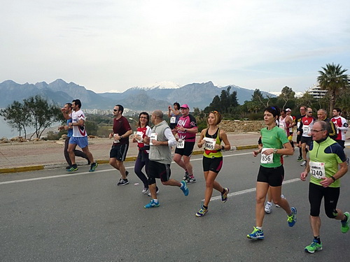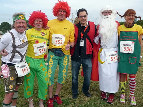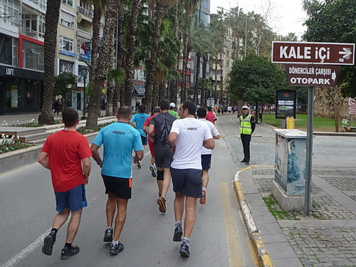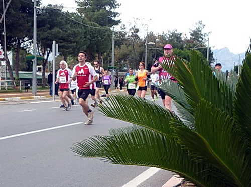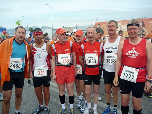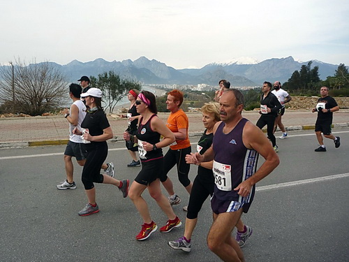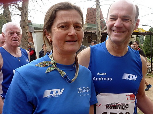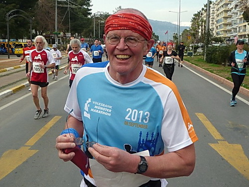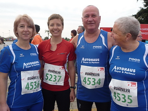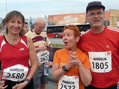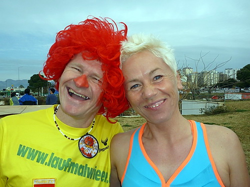 Überall deutsche Winterflüchtlinge. Der Lauftag bietet heute 24 Grad. Die Uferstraße, auf der unser Pumuckl barfuss läuft, wird am Montag witzigerweise neu asphaltiert werden. Thorsten läuft auch als Pumuckl, sonst als Robin Hood, aber sein Bogen wurde nicht in den Flieger gelassen. Martina hat beide Hände verbunden, sie ist gestern beim Training gestürzt. Uwe, der Ideengeber des Antalya Marathons wird ihr das Wasser reichen müssen.