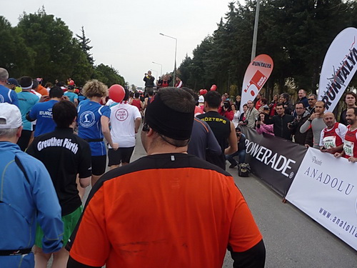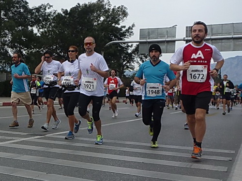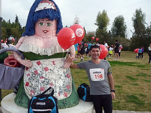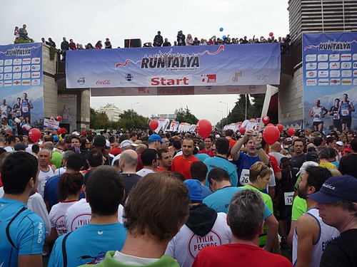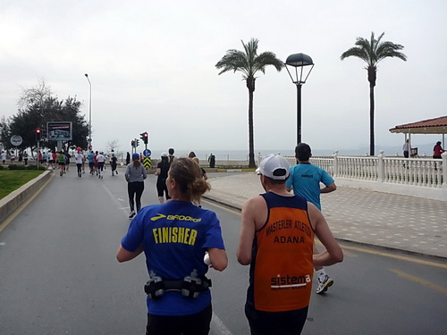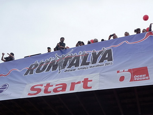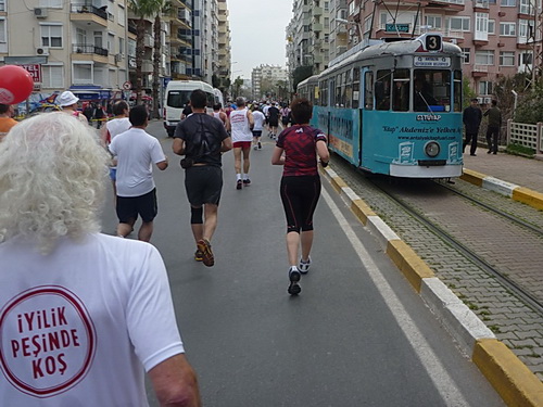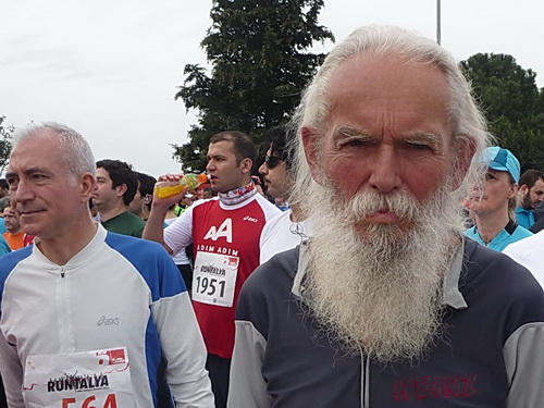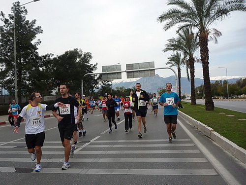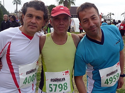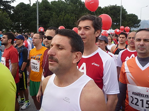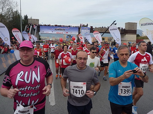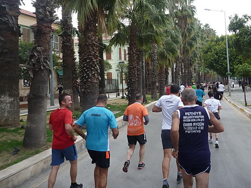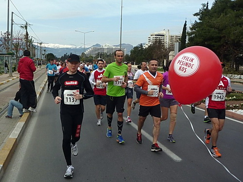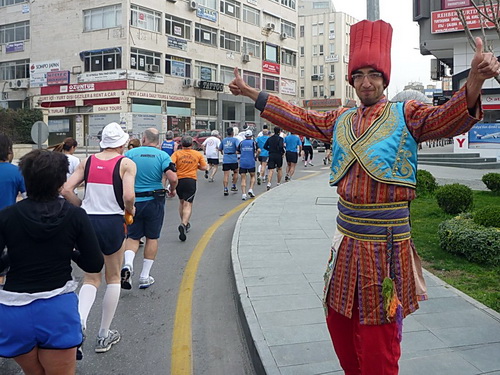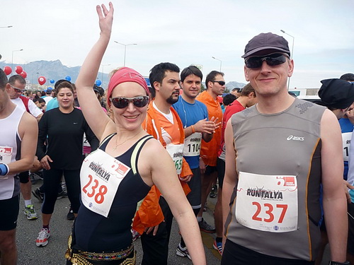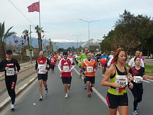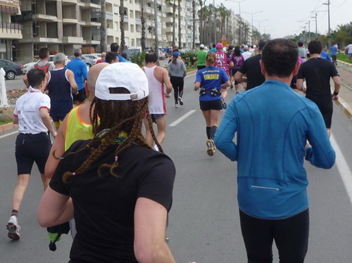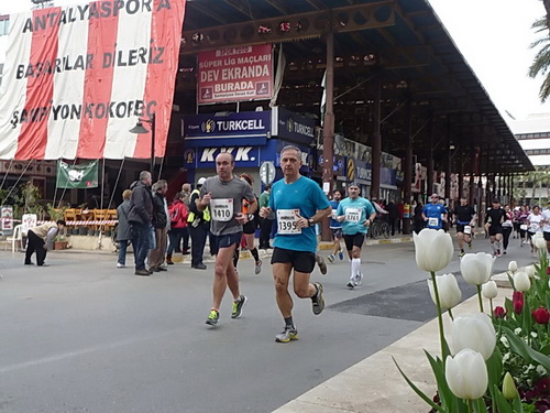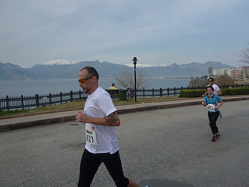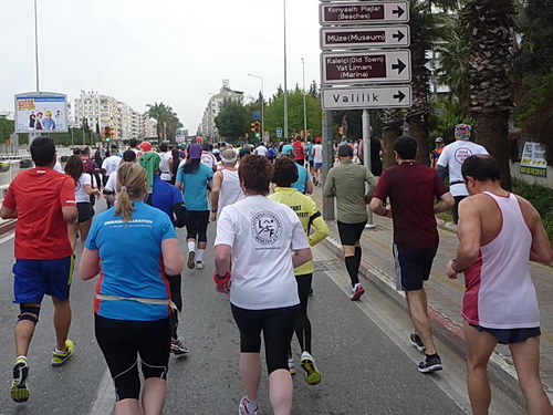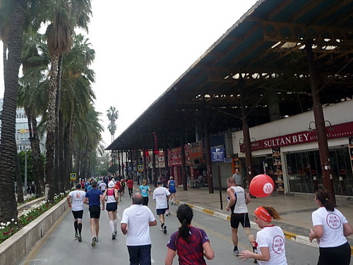 Überall deutsche Winterflüchtlinge. Der Lauftag bietet heute 24 Grad. Die Uferstraße, auf der unser Pumuckl barfuss läuft, wird am Montag witzigerweise neu asphaltiert werden. Thorsten läuft auch als Pumuckl, sonst als Robin Hood, aber sein Bogen wurde nicht in den Flieger gelassen. Martina hat beide Hände verbunden, sie ist gestern beim Training gestürzt. Uwe, der Ideengeber des Antalya Marathons wird ihr das Wasser reichen müssen.