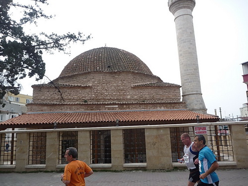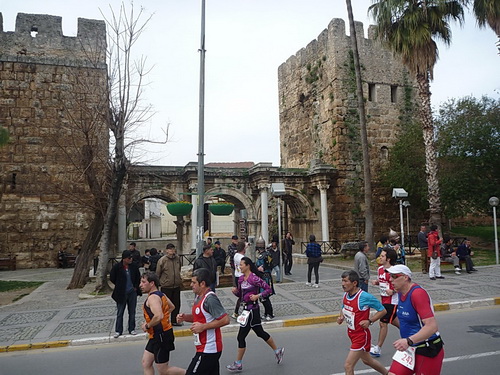 Kurz vor dem Hadrianstor kommen wir am Kebabcenter vorbei, wie eine riesige Bahnhofshalle sieht der überdachte Platz aus. Den Kebab bestellt man in der Türkei grammweise. Geboten wird Huhn- oder Lammfleisch, der Duft strömt die Laufstrecke erfüllt.