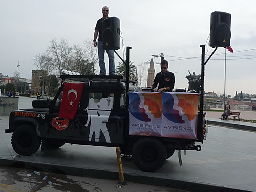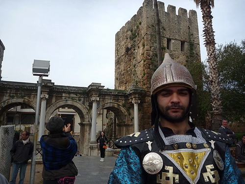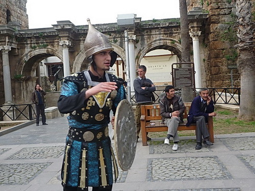 Kurz vor dem Stadtzentrum (Kaleici) überhole ich Yavuz Sap, der wie jedes Jahr auf Krücken die 10 Kilometer zurücklegt. Unter uns nun die von alten Stadtmauern umgebene Altstadt. Die Gassen ziehen sich bis zum Hafen hin. Bars und Restaurants sind in belebten Innenhöfen gelegen, Orangenbäume bieten luftigen Schatten. Die Händler dort haben sich verpflichtet, die Touris nicht anzubabbeln. Wenn doch, dann ruft man das “Sorgentelefon” an, dessen Nummer an den Eingängen der kleinen Geschäfte aushängt. Es ist Geburtstag von Atatürk (Papa der Türken), dem liberalen Staatsgründer.