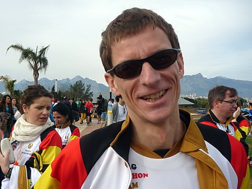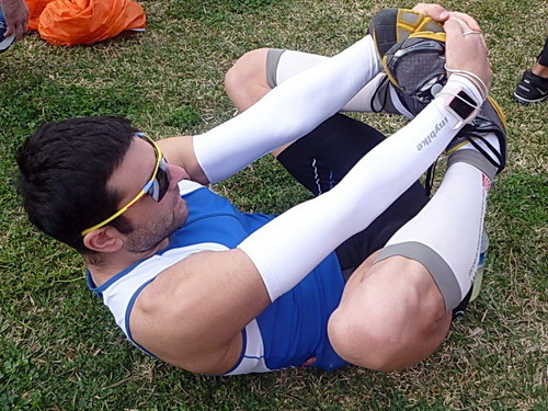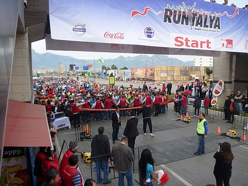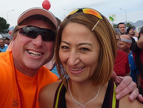 Der Transferbus lässt uns direkt an der Startlinie aussteigen. Wir müssen nur über die Rolltreppe auf die andere Straßenseite. Da werden selbst Marathonläufer zu faulen Socken und bleiben auf der Treppe stehen.