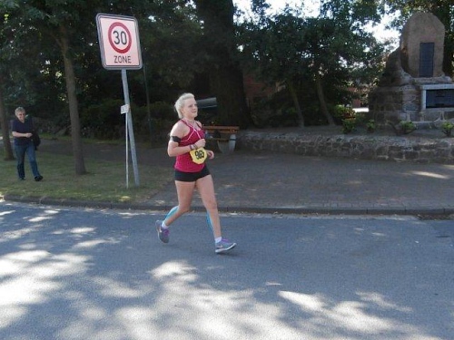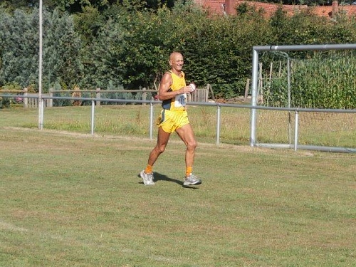 Natürlich ist es nun doch wärmer geworden und ich werde automatisch etwas langsamer. Da die Sonne jetzt höher steht, wird der Schatten auch etwas spärlicher. Aber das wusste ich doch bei einem Start im Sommermonat August. Im letzten Jahr hatte ich in Bissendorf sogar den wärmsten Tag des Jahres erwischt. Da hilft die langjährige Erfahrung schon, damit man auch dann gut über die Distanz kommt. Für die ärztliche Versorgung ist hier ein Rettungswagen im Einsatz. Zum Glück wird er aber nicht benötigt. Hier sind überwiegend erfahrene Läufer auf der Strecke, sodass nur 3 Aussteiger zu vermelden sind.