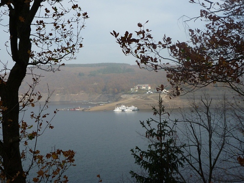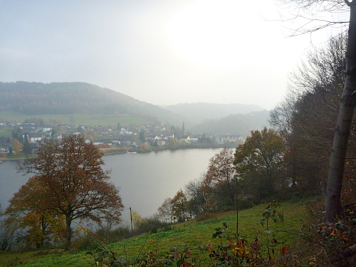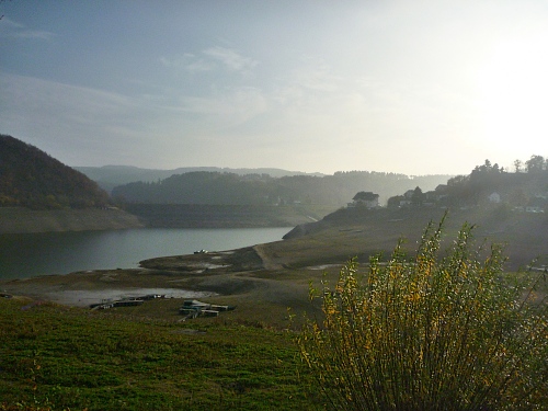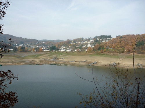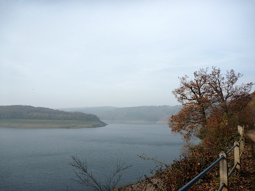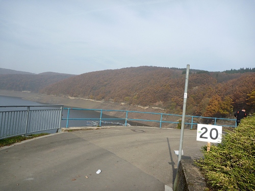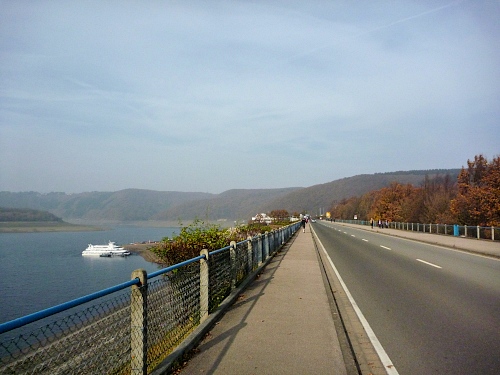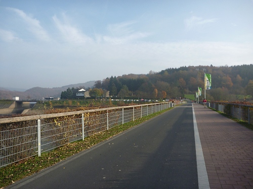 Bei km 19 überqueren wir den Schwammenauelstaudamm, viele Spaziergänger, die den fantastischen Ausblick mit den milchig-herbstlichen Bergen im Hintergrund genießen.