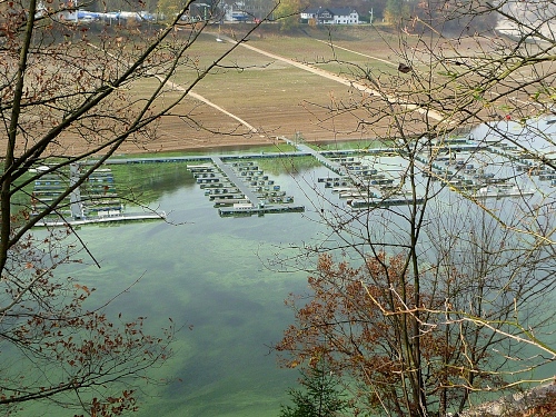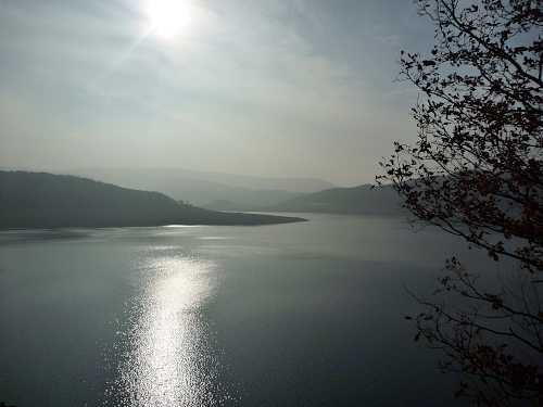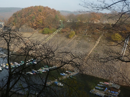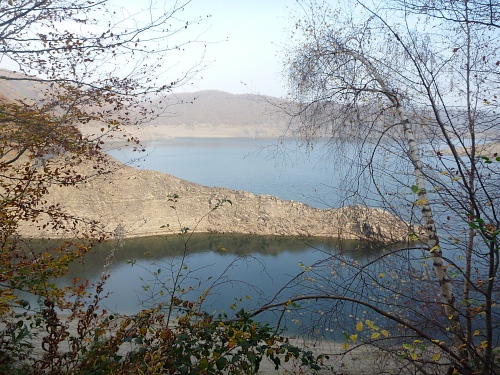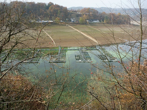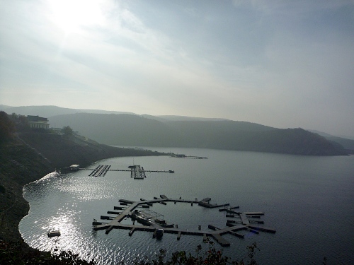 Und jetzt fühle ich mich schlagartig an den Jangtse versetzt, es ist der auffallend niedrige Wasserstand des Stausees. Dies liegt nicht etwa am trockenen Sommer, sondern an den enormen Schneefällen des letzten Winters. Denn in Erwartung der normalen Frühjahresniederschläge musste man das Schmelzwassser schnellstmöglich ablassen. Die sonst normalen Frühjahrsniederschläge fielen aber dieses Jahr aus. Und so sieht man gegenüber am anderen Ufer die ewiglangen Stege hinab zum Wasser, auf denen bootslose Anlagestellen wie Shripsfarmen dümpeln.