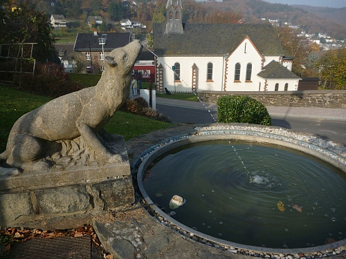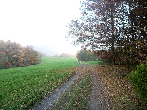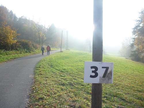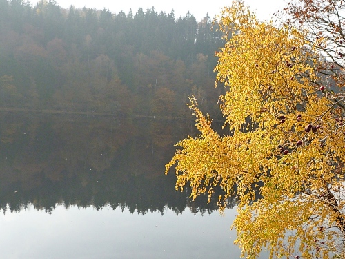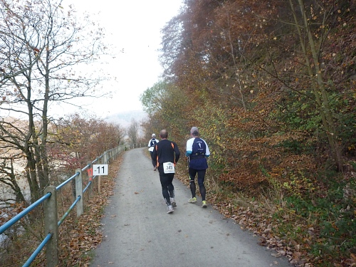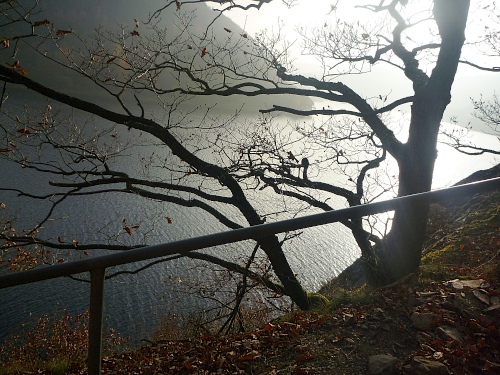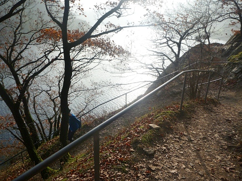 km 31: auf einer Halbinsel liegt Woffelsbach, es geht abwärts und wieder aufwärts. Im Zentrum des Ortes befindet sich der Wolfbrunnen, das erklärt dann auch die Namensherkunft des Ortes. Die folgenden Aussichten in den langsam trüb werdenden Herbstnachmittag über den exotischen See sind einfach umwerfend. Folgerichtig haut es mich auf dem steinigen Weg auch mal wieder hin.