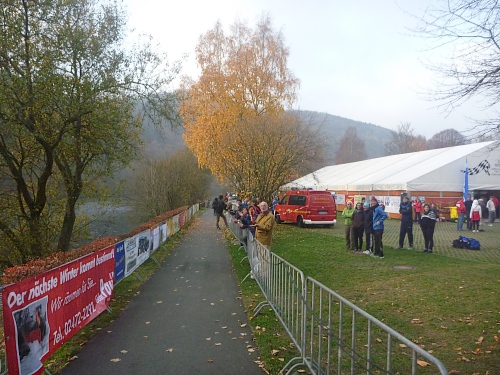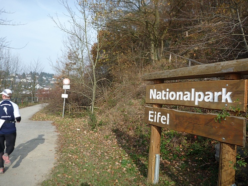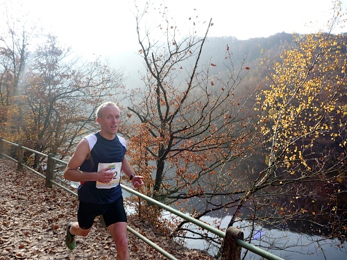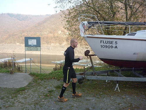 Km 37 steiler Anstieg, aber oben geniale Aussicht weit über das Gold der Eifel. Dann wieder steil hinab zum Obersee. Einruhr ist sichtbar. Vom Zielgelände hört man den Moderator, doch es sind noch 2 wunderbare Kilometer über einen steinigen Uferweg, mit unglaublichem Flair.