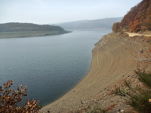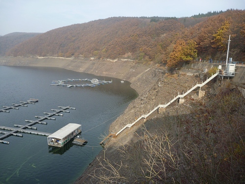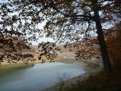 Auch der Paulusdamm (km 12) sperrt einen Durchgang durch den Kermeter, und bildet den Obersee. Die 16,5 km Läufer laufen über den Damm zurück nach Einruhr. Für uns geht es abwärts zum Schwammenauelsee, der unterhalb des Paulusdamms liegt.