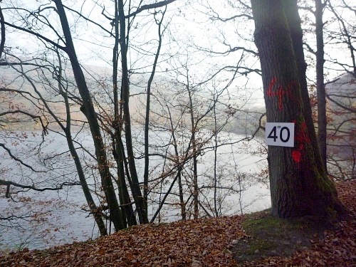Km 35 Rurberg, ohne „h“. Hier sind die zwei Einstiegsstellen für Taucher. Ein Drahtseil führt an das grüne morastige Ufer, weit unten. Menschen, als wären sie Muschelsucher, haben zahlreiche Spuren hinterlassen. Der Eiserbachdann, dann der Paulusdamm, eine gewaltige Anlage.