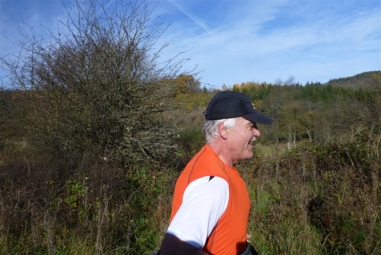 Denn die km 3 – 6 bringen uns vorübergehend vom rechten Weg, nämlich immer schön entlang des Sees, ab und führen quer über den ehemaligen Truppenübungsplatz, der erst seit rund 10 Jahren nach dem Rückzug der Belgier wieder für die Öffentlichkeit freigegeben ist. Allerdings ist es unter Androhung der vorläufigen Erschießung verboten, die Wege zu verlassen, und das aus gutem Grund: Überall liegen noch nach jahrzehntelanger militärischer Nutzung Blindgänger und Munitionsreste herum, die teils nicht per Metalldetektor (z.B. bei Glasminen) gefunden werden können. Nicht einmal Rauchen gestattet man uns, es ist wirklich eine harte Prüfung. Die ist es auch für Lauffreund Jörg, der heute mal ohne seinen Hund Charly unterwegs ist und ihn vermisst.