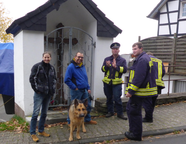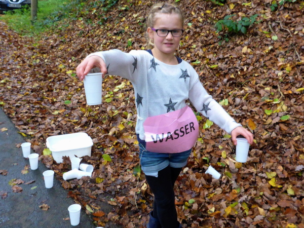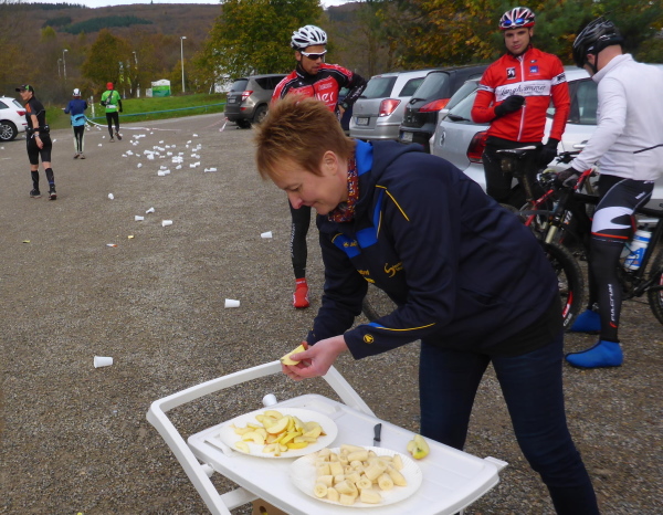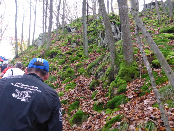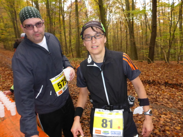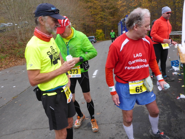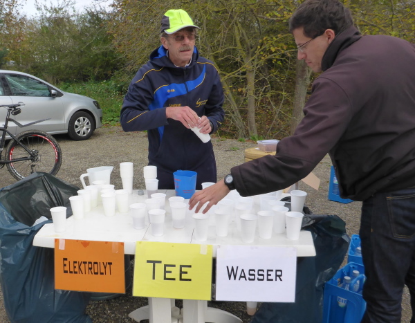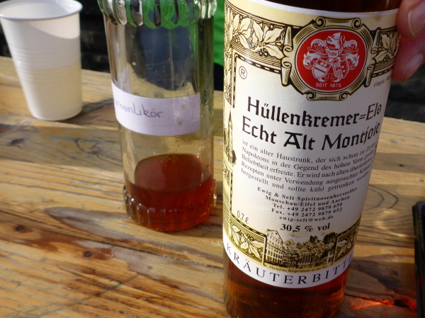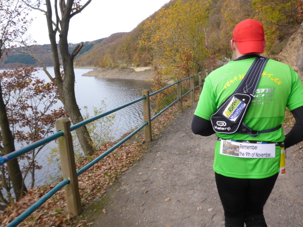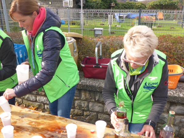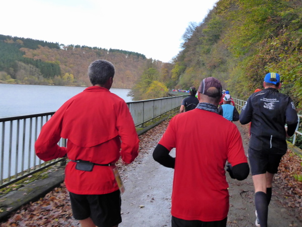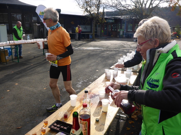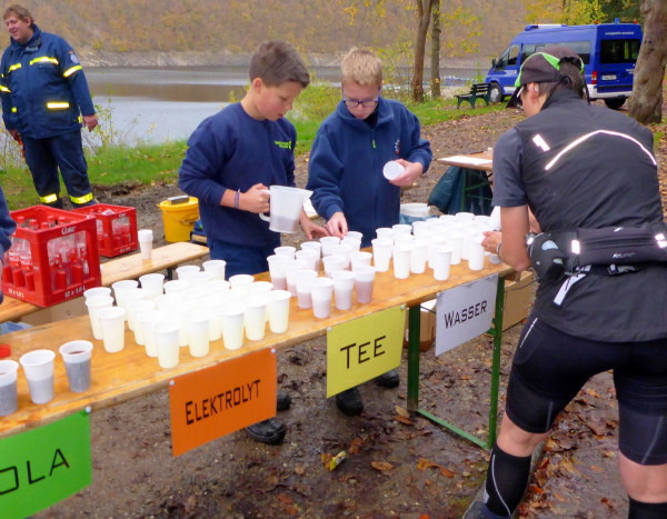 Am Ende der Staumauer erwartet uns die erste VP. Übersichtlich angeordnet gibt es Wasser, Tee und Iso. Ich werde aber magisch vom hinteren Teil der Tischreihe angezogen. Hier wird zur Feier des Tages in winzigen Bechern Pflaumenlikör und „Hüllenkremer Els Echt Alt Montjoie“ angeboten. Dieser Kräuterlikör ist eine Spezialität der Region. Norbert hat ihn gestern schon probiert und ihn als Arzneimittel, nur bedingt zur inneren Anwendung geeignet, klassifiziert. Leider sieht man den Bechern ihren Inhalt nicht an. Ich habe Glück und erwische Pflaumenlikör. Der ist lecker. Ich nehme noch einen Spekulatius Keks auf die Hand. Beschwingt geht es nun bergab.