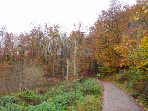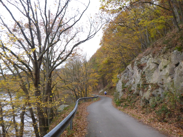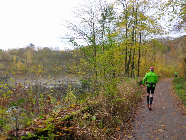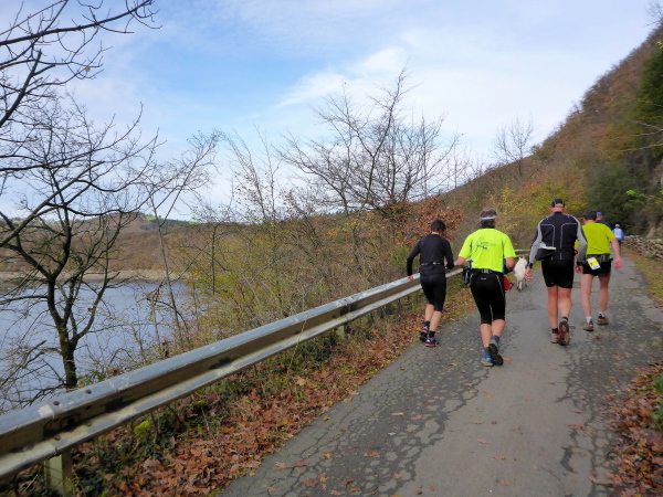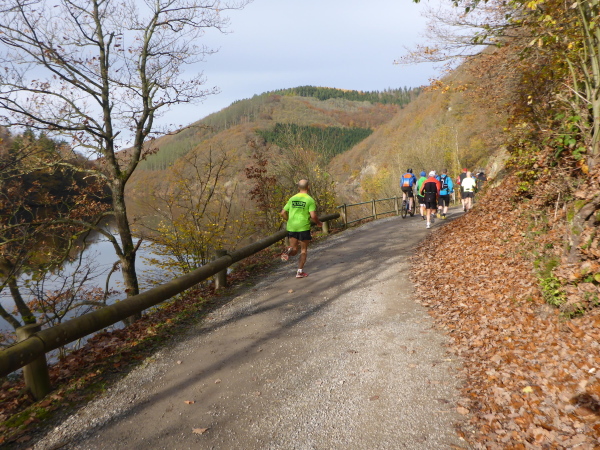 Jetzt geht es wieder direkt am See entlang. Die Sonne scheint. Ich bin fast ein wenig zu warm angezogen. Von hinten wird es laut. Ein Fahrrad kommt klingelnd angeschossen, um den Führenden des 16,5 km Laufs anzukündigen. Christian Nießen führt das Feld souverän an und gewinnt den Lauf dann auch. Wir zählen vier überholende Läufer, dann kommt auch schon die Weiche hinter km 10. Die Schnellen auf der kurzen Strecke gehen nach links über den Paulusdamm die Abkürzung nach Rurberg, wir halten uns rechts und laufen weiter am See entlang.
