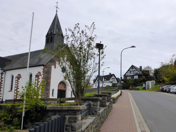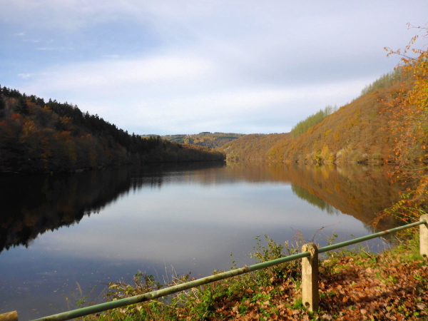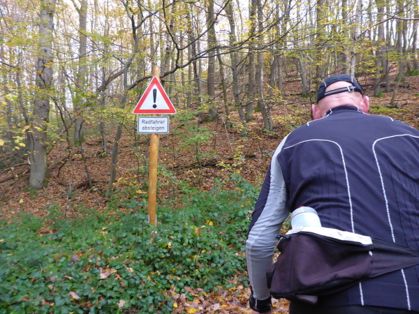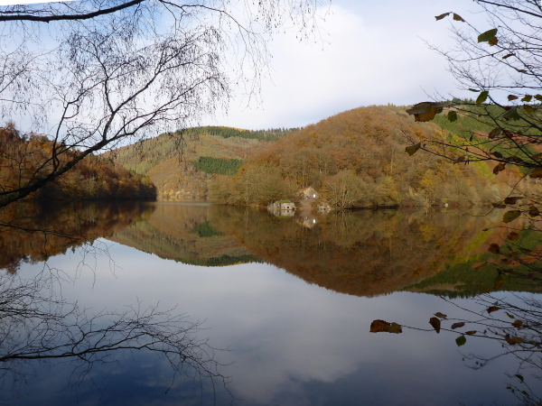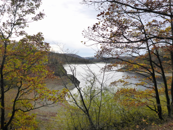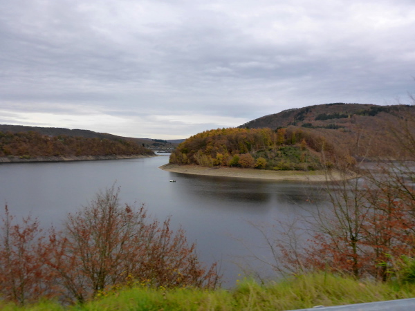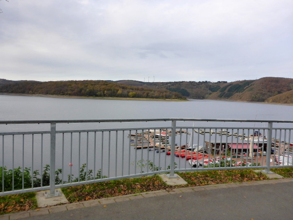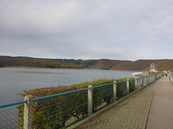 Ich freue mich schon auf den Trail; leider sind es nur ein paar Meter schmaler Wiesenweg. Dann müssen wir an der Straße entlang, auf der wir das Herzstück der Rurtalsperre, Schwammenauel, überqueren. Das mächtige Bauwerk aus dem Jahr 1938 wurde nach Sprengung im 2. Weltkrieg und Wiederaufbau 1965 auf 78 m erhöht. Hauptsächlich soll es der Wasserstandsregulierung der Rur dienen. Aber natürlich wird hier auch Strom erzeugt.