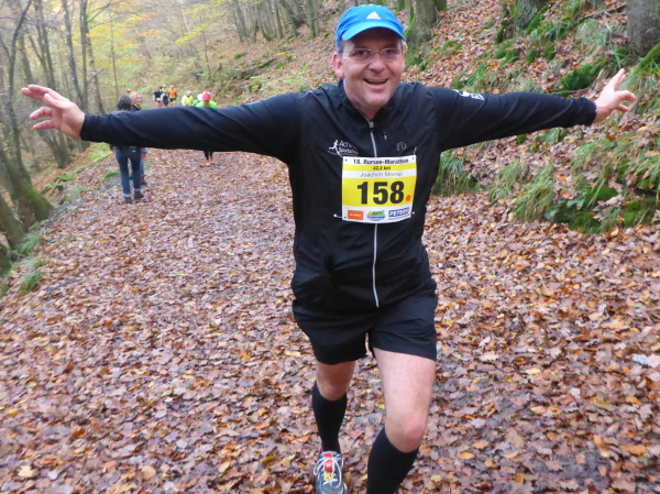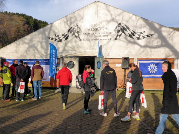 Trotzdem ist heute Sonntag, also für Norbert und mich Marathontag. Wir haben uns die Eifel ausgesucht. Nicht der überall bekannte Monschau Marathon sollte es sein. Nein, wir reisen nach Einruhr am Rursee, einem Ortsteil von Simmerrath. Bereits zum 18. Mal ist der Rursee-Marathon eV. Gastgeber einer breitensportlichen Veranstaltung, bei der auch für Radfahrer respektive Mountainbiker etwas geboten wird. Die anspruchsvolle 40 km lange Eifelhöhen-Tour, auf z.T. extrem matschigem Untergrund, bringt manchen Fahrer an seine Grenzen. Diverse Kinderläufe, ein 5 und ein 16,5 km Lauf - auch für Walker und dann der Marathon runden das Programm ab.