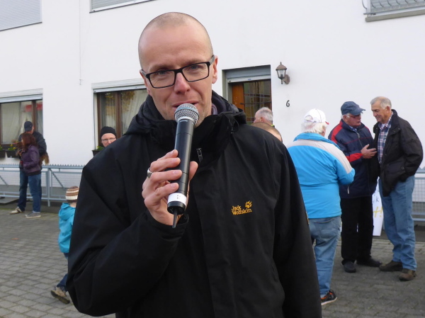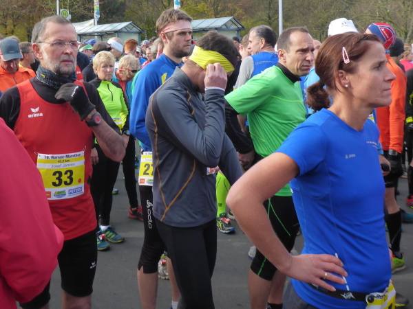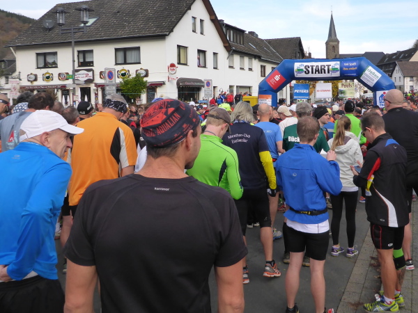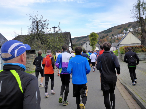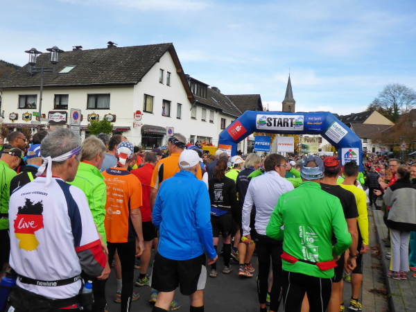 Start ist am Sonntag um 10 Uhr 30. Unsere Pension liegt in Sichtweite des Startbereichs. Nach erholsamem Ausschlafen und opulentem Frühstück begeben wir uns zum Start. Gerade werden ein paar Hände gesucht, um das Starttor aufzustellen. Wir wollen mithelfen, aber da steht es auch schon. Ein Sprecher unterhält die bereits zahlreich erschienen Läufer mit Fakten zum Lauf. So sind heute, dank vieler Nachmelder, an die fünfhundert Marathonis am Start. Das ist wohl auch der Grund, warum sich dieser um 5 Minuten verzögert. Es ist ziemlich kalt, so dass die Läufer währenddessen enger zusammenrücken. Der Bürgermeister von Simmerath, Karl Heinz Hermanns, hält eine erfreulich kurze Rede und gibt noch ein paar gute Worte auf den Weg, dann geht es los.