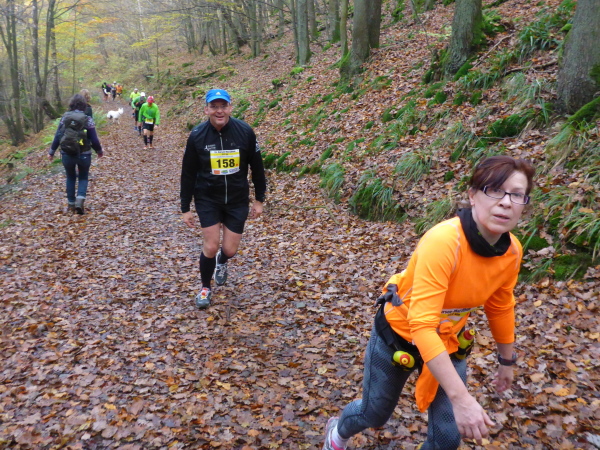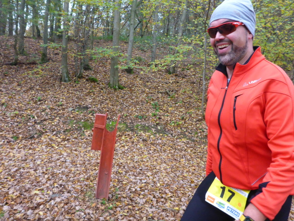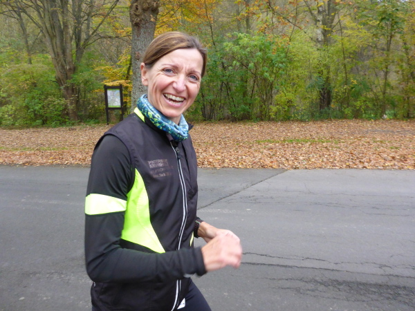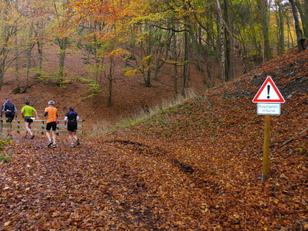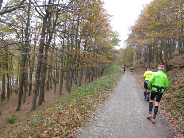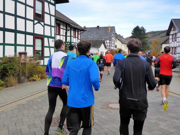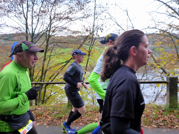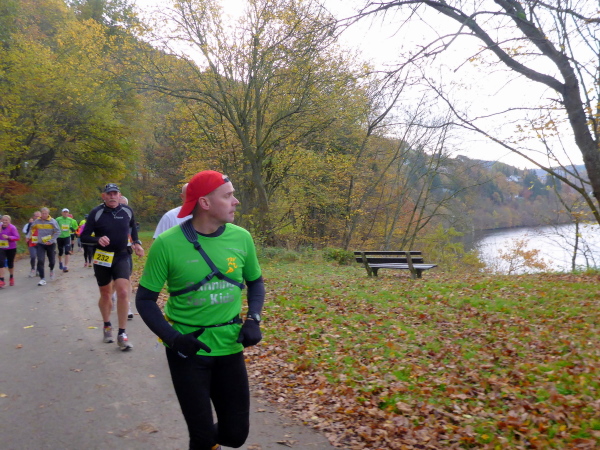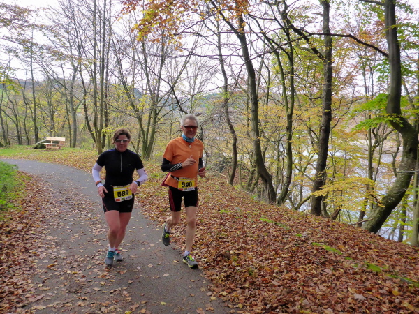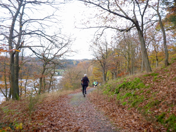 Unter dem Applaus der Zuschauer verlassen wir den Ort mit seinen schönen Fachwerkhäusern. Nachdem wir die letzten Bauwerke hinter uns gelassen haben, geht es jetzt direkt am See entlang. Zunächst versperren noch ein paar Bäume die Sicht und so gibt es ein großes Hallo, als der Blick auf den herbstlich umrandeten See frei wird. Hinter km 2 verlassen wir aber das Gewässer. Es geht einen Feldweg bergauf. Noch sind die Beine frisch, so dass die meisten locker hinauf laufen. Wieder bergab führt der Weg dann weiter wellig am See entlang. Das Feld ist bereits auseinander gezogen, so fällt es nicht schwer, den matschigen Stellen auszuweichen.