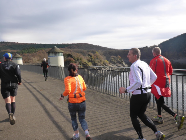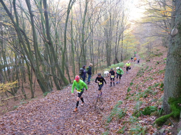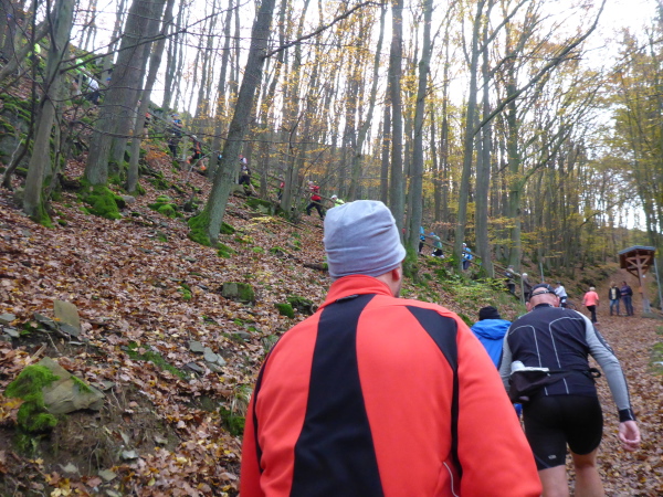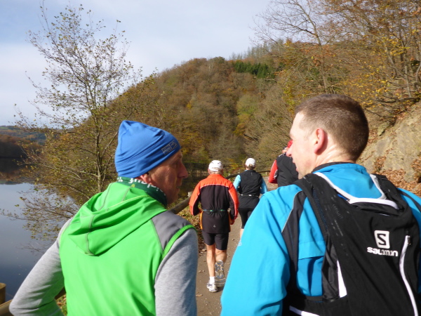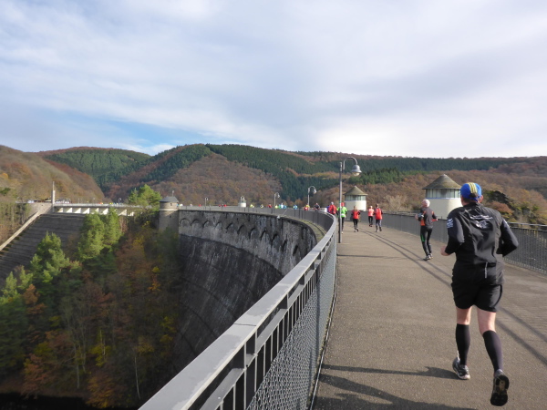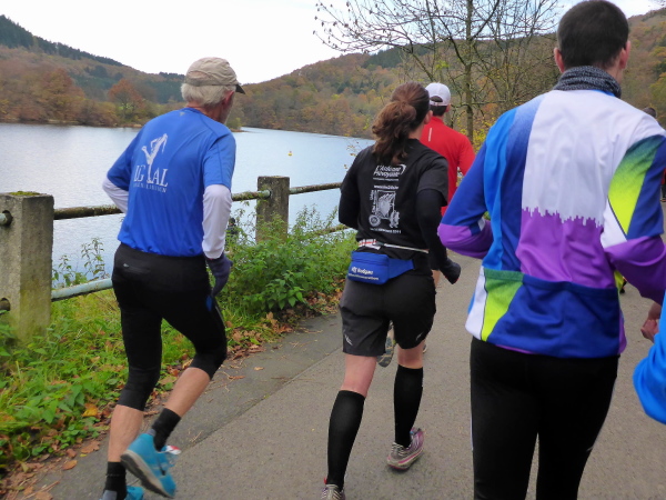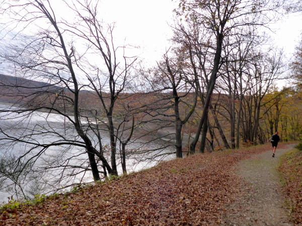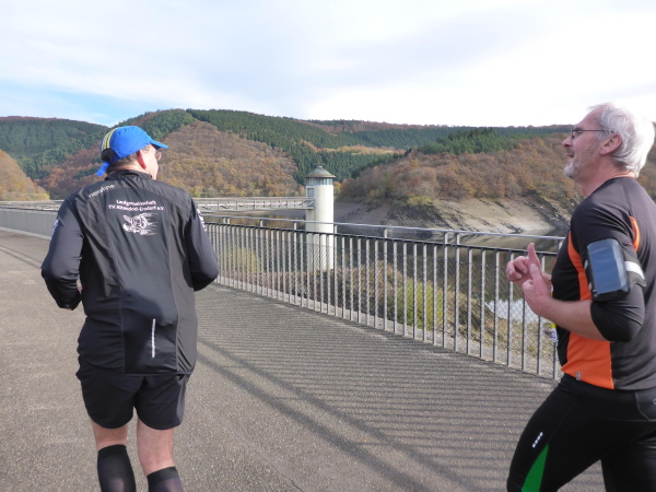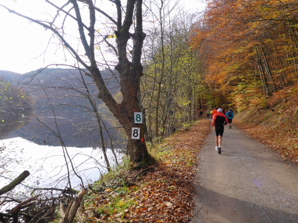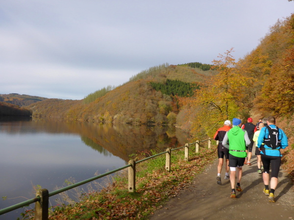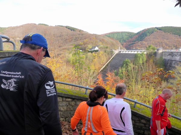 Plötzlich geht es bergauf, und das auch noch ziemlich steil. Der Singletrail zwingt die Läufer in den Gänsemarsch. Das geht ganz schön in die Beine. Hinter der nächsten Kurve öffnet sich der Wald und die Urfttalsperre liegt unter uns. Noch ein paar Stufen hinunter, dann geht es direkt über die 58 m hohe Staumauer. Als sie 1900 gebaut wurde, war sie die größte Staumauer Europas. Sie staut die Urft zum Urftstausee zu unserer Rechten. Links unterhalb liegt der Obersee, der zum Rursee gehört.