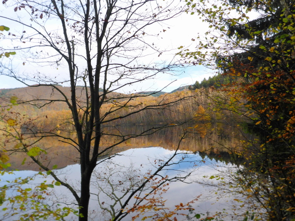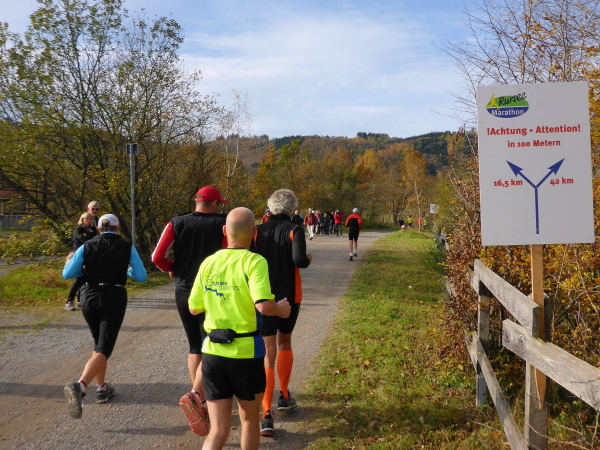3 junge Leute feuern hier die Vorbeikommenden frenetisch mit einer Vuvuzela an. Auf ihrem Transparent steht „Du schaffst das Maike“. Toll, wenn man solche Freunde hat. Ich genieße den wunderbaren Blick über den ruhig daliegenden See, in dem sich das bunte Herbstlaub der gegenüber liegenden Insel Eichert spiegelt.