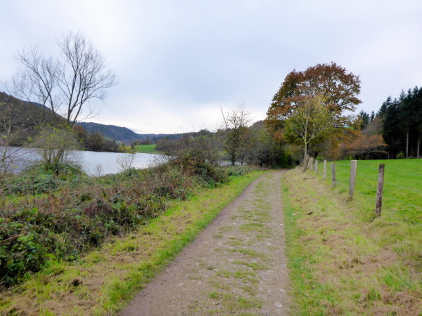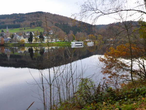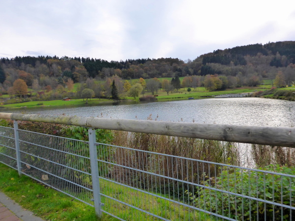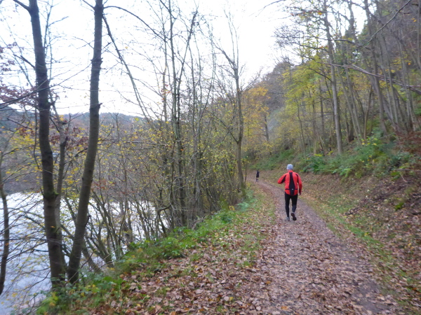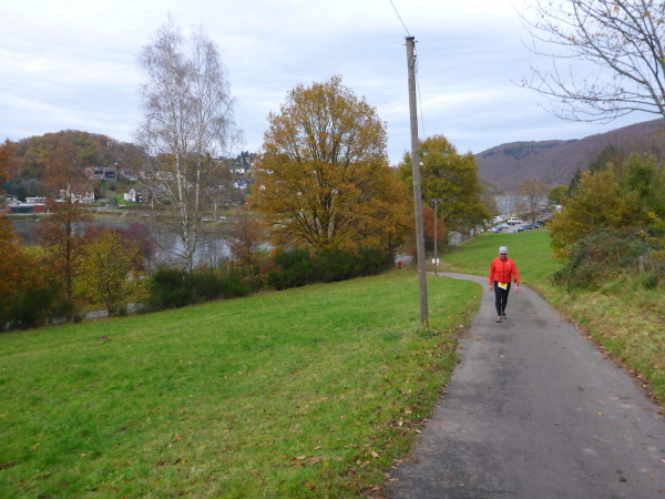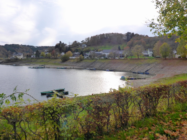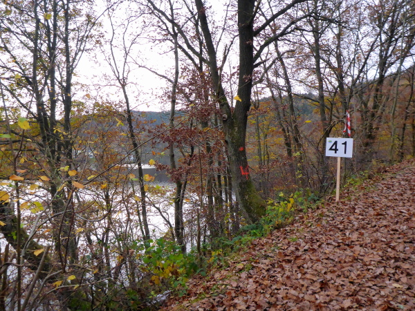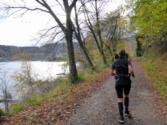 Bei km 36 erreichen wir die Uferpromenade von Rurberg. Hier sind viele Spaziergänger unterwegs. Auf den letzten Kilometern war es wunderbar ruhig, so dass mich die Menschenmassen etwas überfordern. Auch die Autofahrer haben Probleme, beim Ausparken die Läufer auf dem Gehweg nicht zu übersehen. Ich bin froh, als wir den Eiserbachdamm erreichen. Er staut den kleinen Eiserbach zum Eiserbachsee. Wer steht wieder hier und feuert uns an? Natürlich die Freunde von „Maike“ nun bereits zum dritten Mal. Sie haben heute ihren eigenen Marathon.