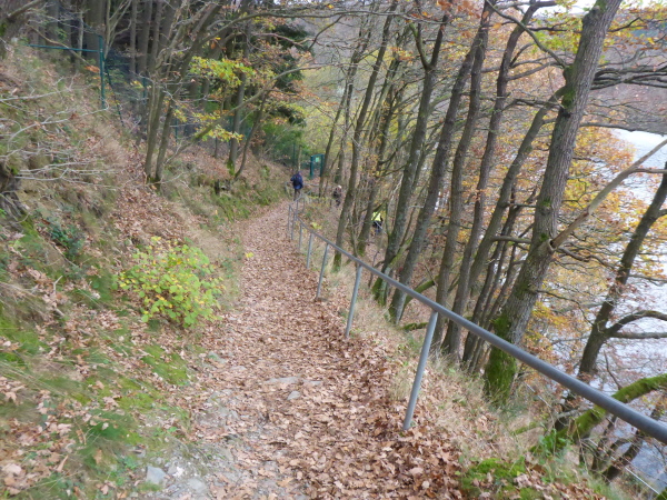 Es geht bergab. Dann kommt ein schöner Singletrail, so wie ich ihn liebe. Zuerst steil bergab mit Geländer zum Festhalten, dann direkt am Ufer entlang laufe ich nun wieder lockerer. Es sind noch 3 Kilometer. Wider Erwarten kann ich nochmals Tempo machen. Kleinere Steigungen sind nun plötzlich kein Problem mehr und ich kann sogar einige Läufer einsammeln, was zusätzlich motiviert. Eine größere Steigung gehe ich flott hinauf, beim folgenden Gefälle gebe ich nochmal richtig Gas. Ausruhen kann ich später.
