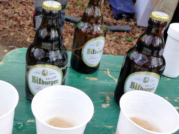 Wir überqueren den Damm. Auf der anderen Seite werden wir nach rechts geleitet. Hier sind vor Stunden auch die 16,5 km Läufer über den nahen Paulusdamm gekommen. Nun geht es unerwartet lang und steil bergauf, km 37. Mit jedem Schritt entferne ich mich mehr von meiner Wunschzeit von 5 Stunden. Ich habe keine Kraft mehr in den Beinen. Oben angekommen, kann ich nur schwer wieder anlaufen. Wir haben einen tollen Blick zum See und der Wiesenweg geht leicht bergab. Bei km 38 wird es kurz steil hinunter zur VP. Es ist die letzte VP und sehr gemütlich. Im dämmerigen Wald werden wir mit einer Fackel empfangen. Es gibt zum Obst jetzt auch Schokolade. Ich will mich gerade darauf stürzen, da sehe ich ganz am Ende des Tisches Bier: Echtes Bitburger Pils! Ich lasse die Schokolade Schokolade sein und bunkere lieber isotonisch Kohlehydrate.