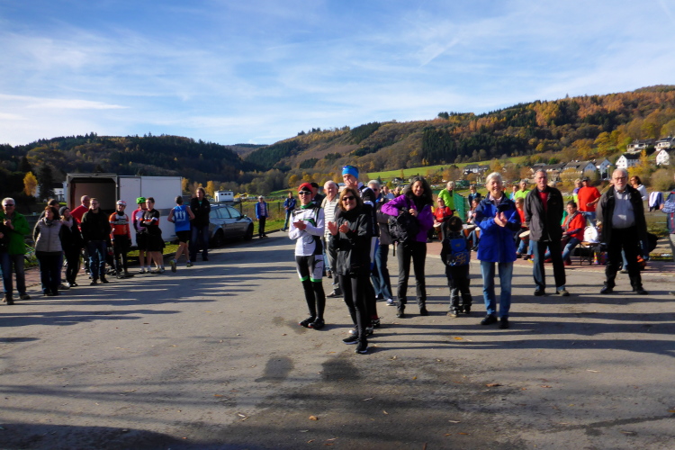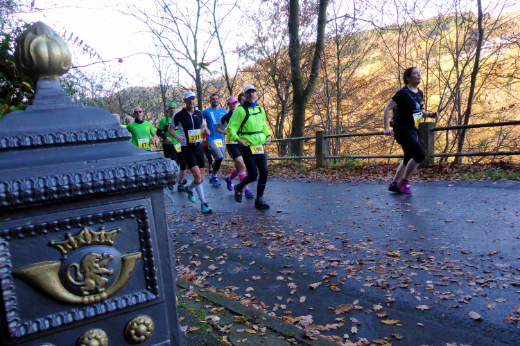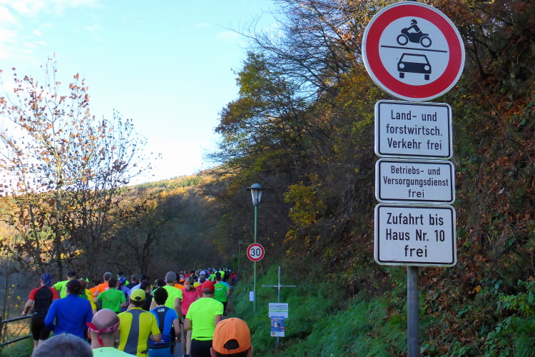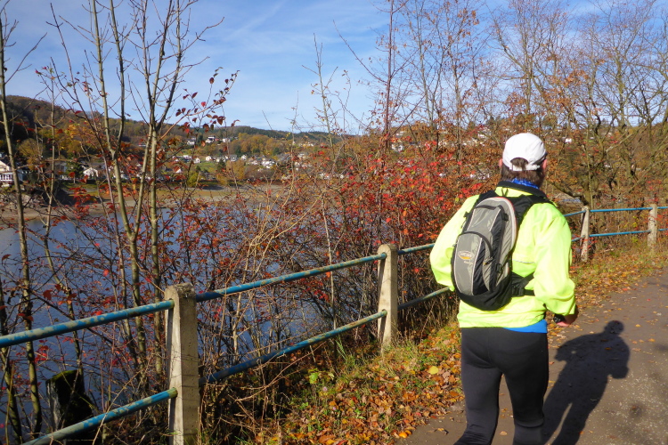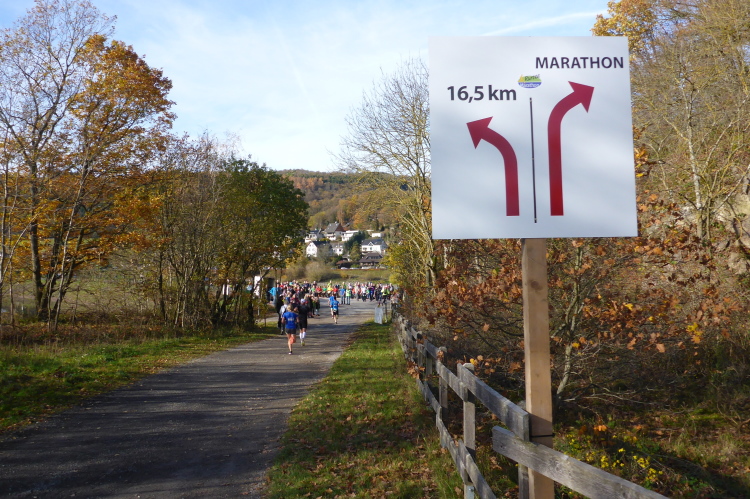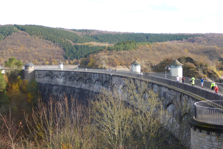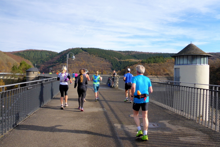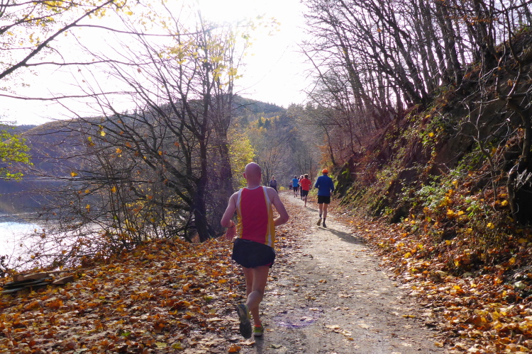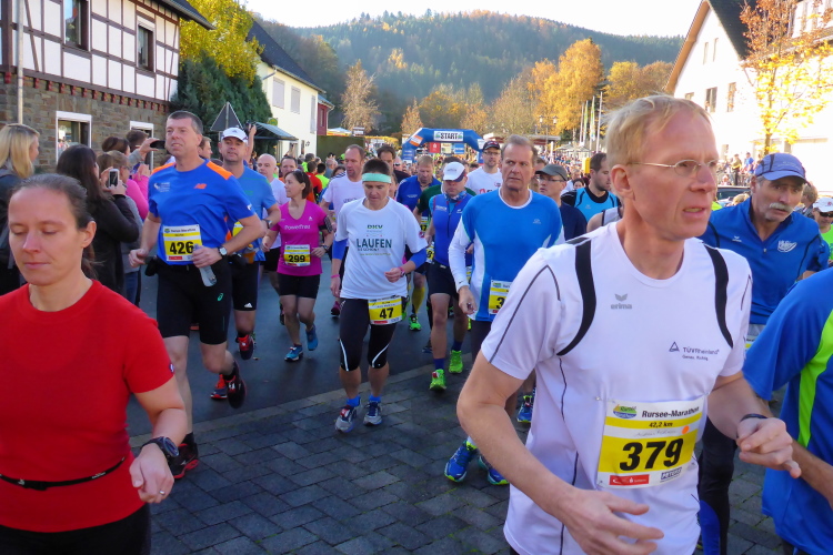 Wer die Ruhr hat, der muss sich auch schnell bewegen, das gibt sich aber nach spätestens zwei Tagen, dann liegt man flach. Der Rurseemarathon ist relativ flach und einfach, man muss nur einmal um das ganze Seengebilde, entstanden durch Sperren, Vorsperren, Felsschüttdämmen, Stützkörper, Überfallwehre, Aufbauten usw. rumlaufen. Es gibt keine Kilometerschinderei in Industriegebieten oder durch verträumte Vorstädte, keine ewig langen, einsamen Straßen, keine dunkle Wälder und keine geparkten Autos. Links gibt es immer irgendeinen Stausee mit herbstfarbenen Ufern oder einer Insel, rechts farbenfroher, heller Laubwald. Wegen der vielen gefluteten Täler gleicht die Streckenführung den Linien von Nasca, wer sie kapieren will, der muss Überflieger sein.