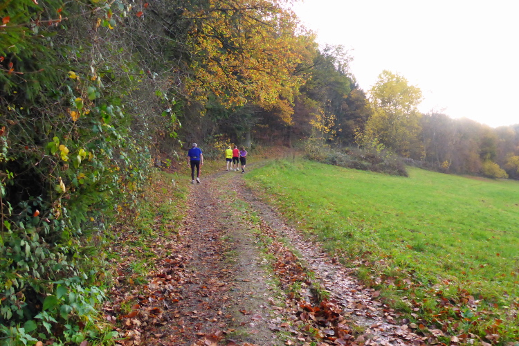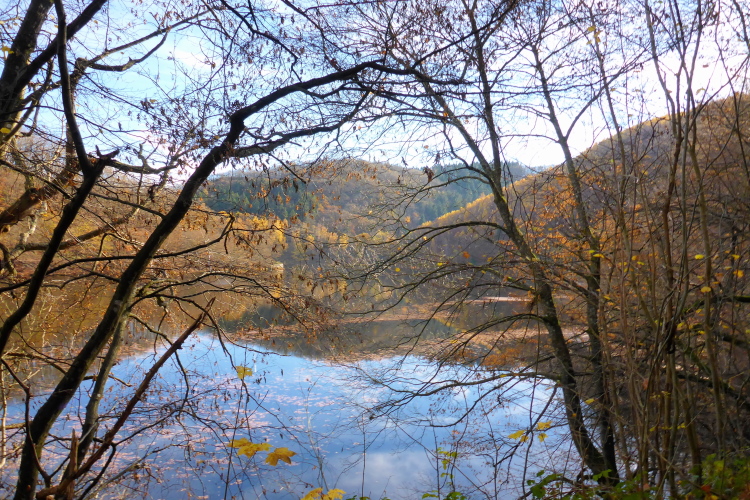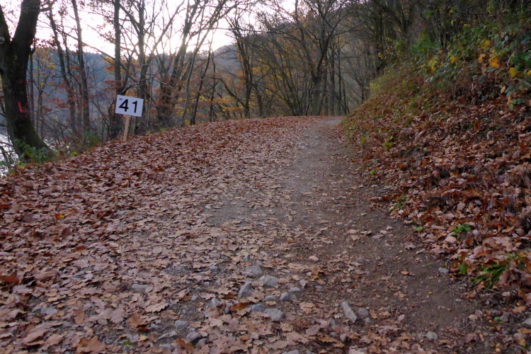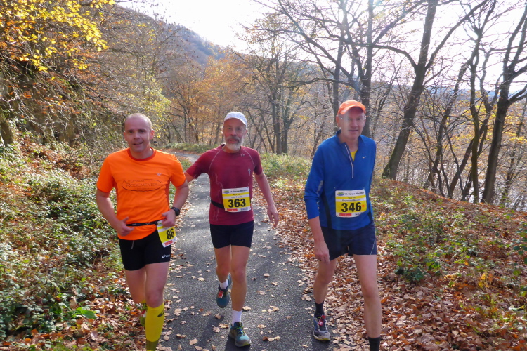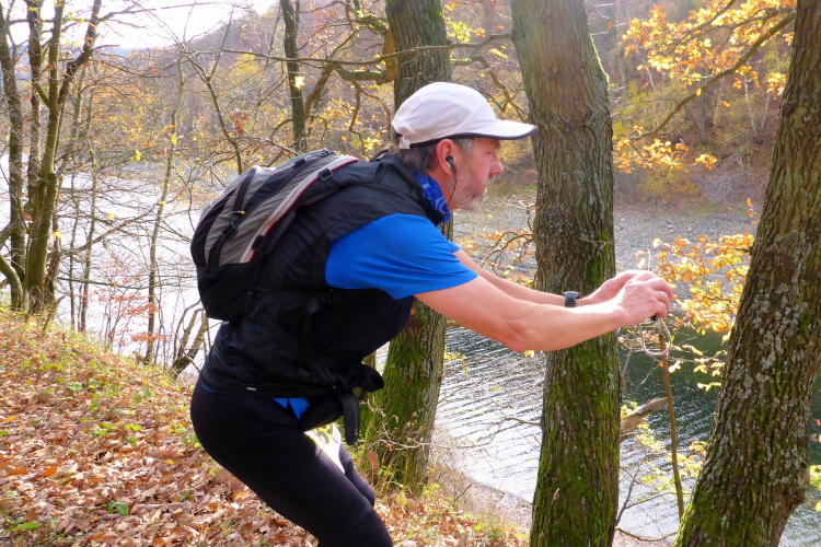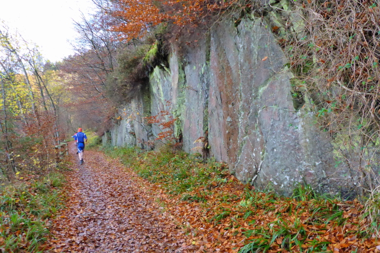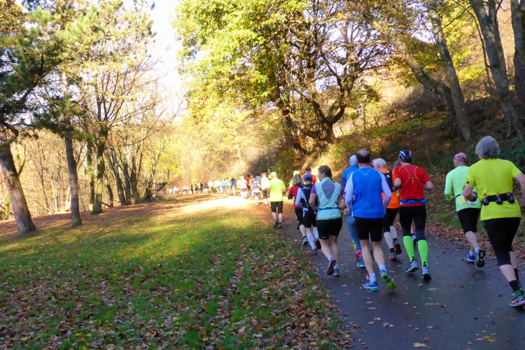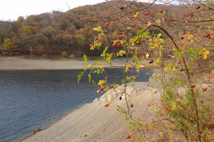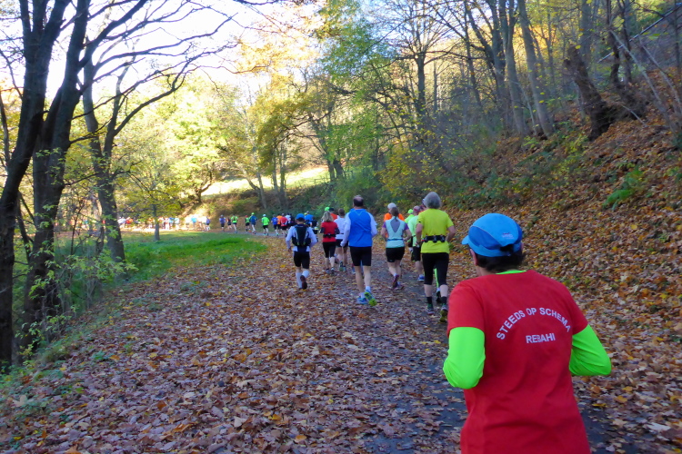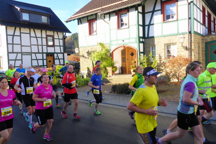 Wer die Ruhr hat, der muss sich auch schnell bewegen, das gibt sich aber nach spätestens zwei Tagen, dann liegt man flach. Der Rurseemarathon ist relativ flach und einfach, man muss nur einmal um das ganze Seengebilde, entstanden durch Sperren, Vorsperren, Felsschüttdämmen, Stützkörper, Überfallwehre, Aufbauten usw. rumlaufen. Es gibt keine Kilometerschinderei in Industriegebieten oder durch verträumte Vorstädte, keine ewig langen, einsamen Straßen, keine dunkle Wälder und keine geparkten Autos. Links gibt es immer irgendeinen Stausee mit herbstfarbenen Ufern oder einer Insel, rechts farbenfroher, heller Laubwald. Wegen der vielen gefluteten Täler gleicht die Streckenführung den Linien von Nasca, wer sie kapieren will, der muss Überflieger sein.