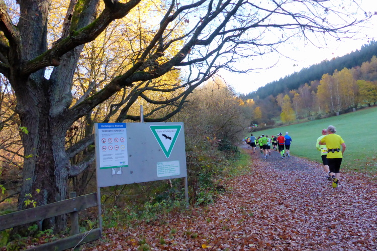 10:30 Start. Schnell hat sich das Läuferfeld verteilt. Nach kaum 2 Kilometer laufen wir in das Gebiet des ehemaligen Truppenübungsplatzes. Die Warnschilder kann man nicht übersehen, und dennoch zieht es sofort Läufer mit Schwachstellen in die Büsche, in dem Vertrauen, es sei alles Explosives entfernt worden, und die eigene Explosion vorangig.