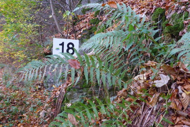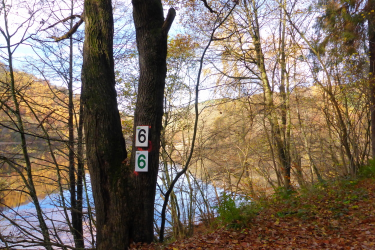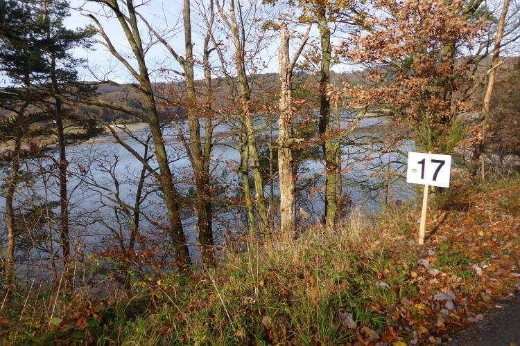 Wir biegen nach rechts zum Rurstausee ab. Eine Granate diente einmal als Befestigung für eine Schranke - makabres Überbleibsel des Truppenübungsplatzes. Auf der gegenüberliegenden Seite liegt jetzt Rurberg, das 2011 in einer repräsentativen Umfrage des renommierten forsa-Institutes als unbekanntester Ort Deutschlands ermittelt wurde. Wenn wir später, bei km 36, durch Rurberg laufen werden, wird sich zumindest der Marathonläufer an diesen Ort erinnern.