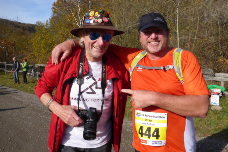 Michael, heute mit Familie AN der Strecke, erklärt mir nicht ganz glaubhaft, warum er nicht AUF der Strecke ist. Peter Borsdorf, der für kranke Kinder Spenden sammelt, ist Träger des Bundesverdienstkreuzes und eines ledernen Australienhuts und fotografiert die Läufer.