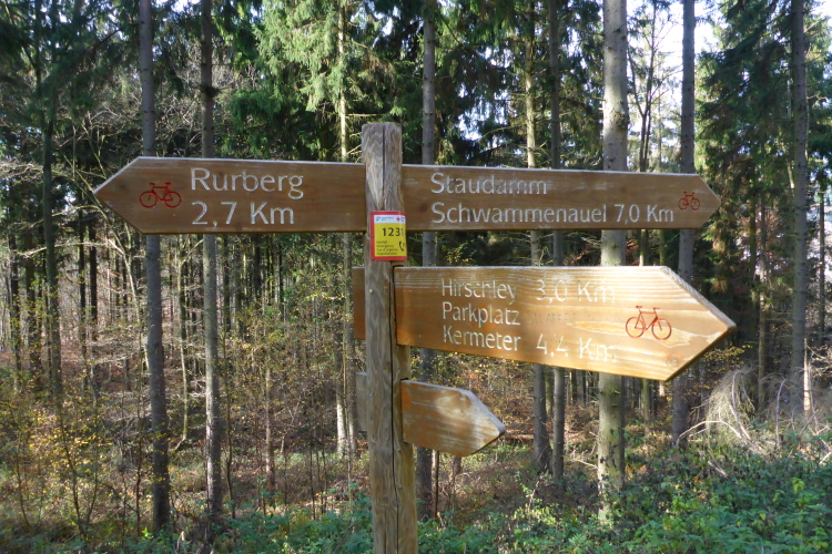Der Bergrücken, den wir hinaufwandern, nennt sich Kermeter, ragt wie ein Fersensporn in den Obersee hinein und schützt wie ein Bollwerk die Urftalsperre. Für Flieger nicht erreichbar, warfen sie angesichts des Bergrückens schnell ihre Last ab und zogen die Maschine nach oben. Nach dem Krieg diente der Bergrücken als Kugelfang für die übenden Belgier. Er ist nun sehr bleihaltig.