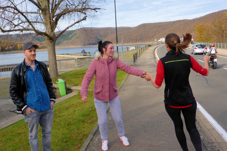 Gut laufen kann man auch, und zwar auf dem Eiserbachdamm. Man muss nur den zahllosen Spaziergängern ausweichen. THW und Feuerwehr wachen darüber, dass wir nicht umgefahren werden. Wenn ich ankomme, werden schon lange vorher die Autos angehalten, dann zücken die Insassen Fotoaparate, hängen sich aus den Fenstern, jubeln mir zu und werfen weisse Rosen.