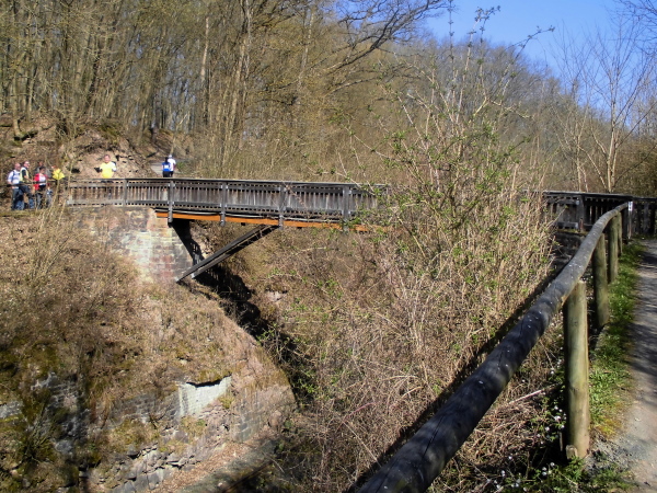 Oben angekommen, konnten wir kurz eine tolle Aussicht genießen, bevor es wieder durch ein schönes Waldgebiet ging. Gleich am Waldrand verließen uns die Kurzstreckler und wir teilten uns den weiteren Weg nur noch mit den Halbmarathonis. Immer wieder kam ich während des Laufens mit den überwiegend fränkischen Teilnehmern ins Gespräch, was die ganze Sache sehr kurzweilig machte. Doch eigentlich sind hier Ablenkungsgespräche gar nicht notwendig. Was uns schon auf den ersten zwanzig Kilometern an Strecke geboten wurde, war ein reines Laufvergnügen. Das sahen auch ausnahmslos meine Mitstreiter so. Herrliche Waldgebiete, tolle Aussichten, teilweise schön zu laufende Trails, idyllische Wege entlang der fränkischen Saale, dazu das frühlingshafte Wetter ließen die Zeit wie im Flug vergehen.