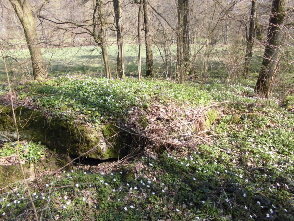 Gleich nachdem wir Euerdorf hinter uns gelassen hatten, wartete der nächste Anstieg auf uns. Ein entsprechendes Hinweisschild bereitete uns darauf vor. Demnach befanden uns auf dem „Weg durch die Zeit“ und die steile Wegstrecke führte über den eiszeitlich Wasserriss. Eine ganze Weile ging es im Schatten der Bäume nach oben, bevor wir die Ruine Aura erreichten. 1618 hatte der damalige Würzburger Erzbischof den Bau einer Kirche, die später als Wallfahrtskirche dienen sollte, in Auftrag gegeben. Sie wurde aber wegen des Beginns des dreißigjährigen Krieges und des Todes des Erzbischofs nie vollendet.