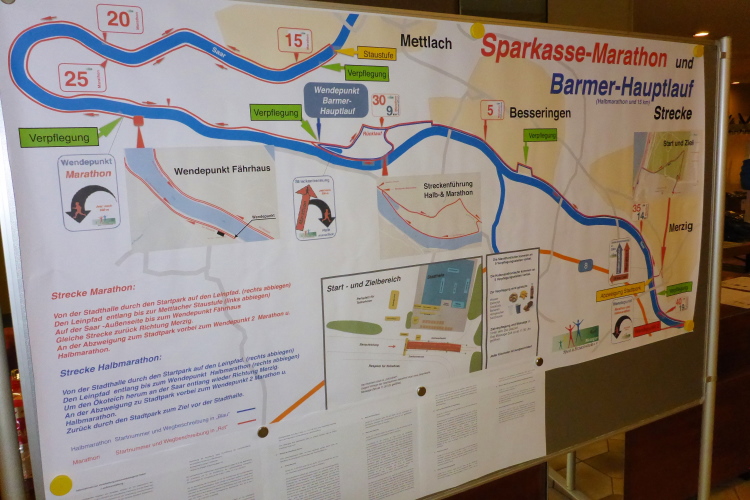 Am ersten Sonntag im September ist Marathontag in Merzig. Die Veranstaltung wird SaarschleifenLand Marathon genannt. Merzig liegt in einer länglichen Talaue der Saar. Klimatisch begünstigt, ergeben die Apfelbäume rund um Merzig einen sehr guten Apfelwein. Der wird Viez genannt, weil man davon die Viezekacke bekommt. Und wo man diese bekommt, da braucht man gute Porzellanschüsseln. Was Hoechster Porzellan in Frankfurt, sind in Merzig die Produkte von Villeroy und Boch. Die werden nämlich hier hergestellt, und die gibt es auch in der Stadthalle, wo die Startnummernausgabe ist.