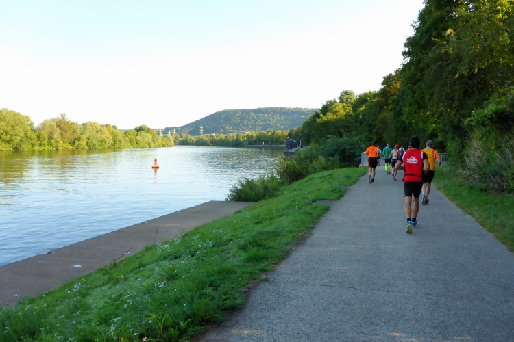 8:30 Start. Nach einigen Metern durch den Stadtpark laufen wir schon auf dem Uferweg saarabwärts. Jemand schrieb mir, der Lauf sei langweilig. Das stimmt zwar nicht, würde mir aber nichts ausmachen, denn ich trainiere für die 220 Kilometer, die ich nächste Woche in Albanien laufen werde. Bei nur 72 Marathonläufern hat man viel Platz. Viel mehr sind es auf der 15 und auf der 21 km Strecke, die später gestartet werden.