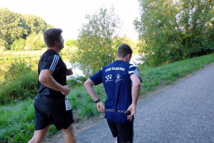 Über der gesamten Laufstrecke liegt eine angenehme Stille. Die spiegelglatte Wasseroberfläche der Altarme der Saar schlucken jedes Geräusch, außer dem einsamen Tapp-Tapp meiner Hokas, von denen sich Teile der Sohle ablösen. Also versuche ich auf einem Bein stehend die Teile abzureißen, was in einen Vieztanz ausartet. Ich entscheide mich, ordentlich die Füße zu heben und die Schuhe dann in Albanien zu verschenken. Aber wer braucht dort Saarkähne?