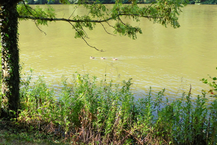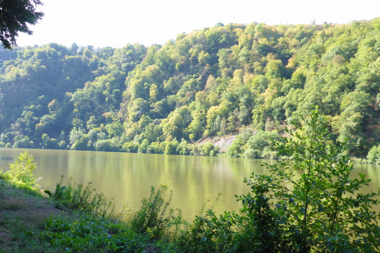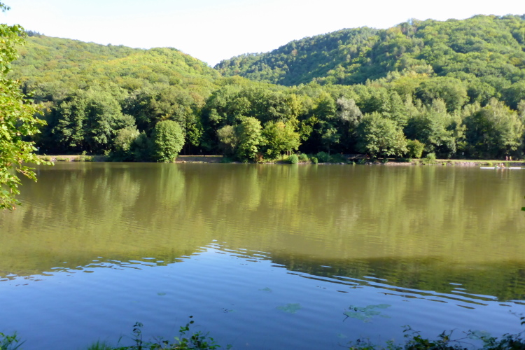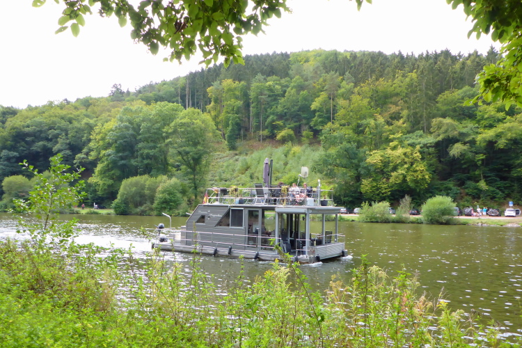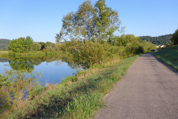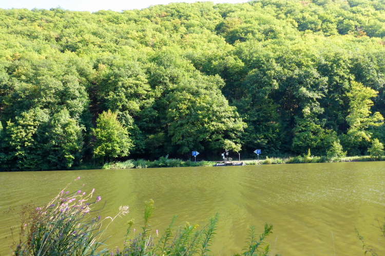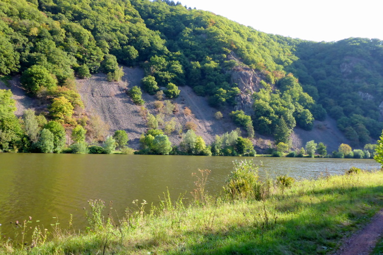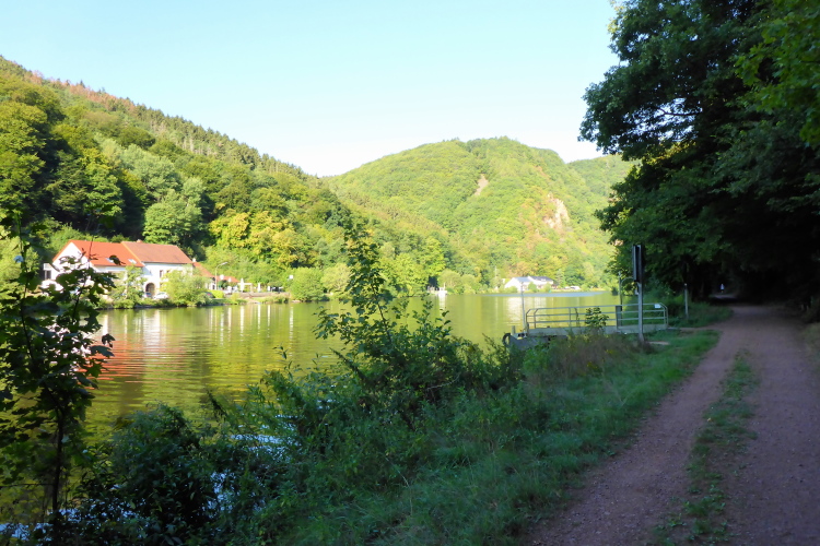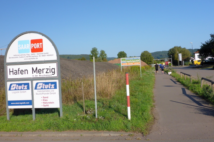 Schon bald verlassen wir das Ufer für kurze Zeit, wir müssen um den Hafen laufen. Ja, es gibt einen Hafen, in dem werden Schotter aus Basalt und schieferartigem Gestein aus der Gegend verladen. Es gibt auch noch einen Yachthafen, der ist bei der Saarfürst Brauerei.