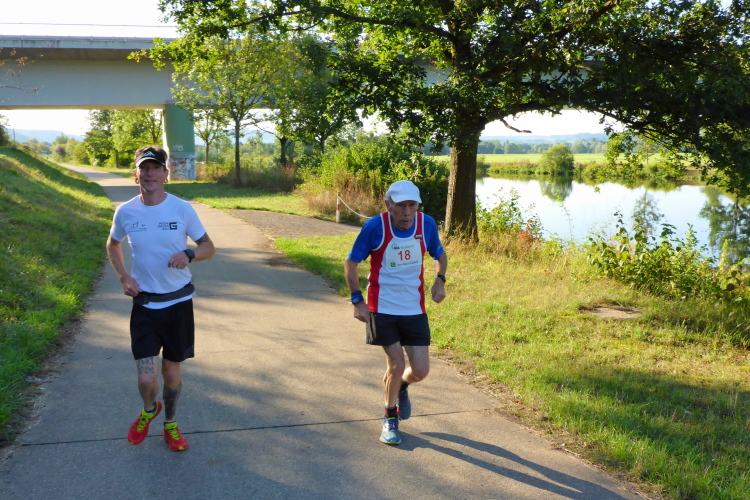 Ich beobachte, wer mir entgegenläuft und wen ich noch einholen kann. Rund um das Steinbachtal wird es wildromantisch. Der Steinbach führt kaum Wasser, doch die Steinkrebse werden in den Pfützen überleben. Kurzes Gespräch mit Charly, dem Alphornbläser, dann ist der Wendepunkt am Alten Fährhaus erreicht. Die Felsen in meinen Schuhen haben kein stilles Plätzchen gefunden, ich muss mich setzen, um den Ballast zu entfernen. Mein ehemals gebrochener Fuß ist geschwollen, also Schnürsenkel lockern und Aufholjagd starten. Das gelingt mir nach der wiederholten Querung der der Schleuse, es läuft gut.