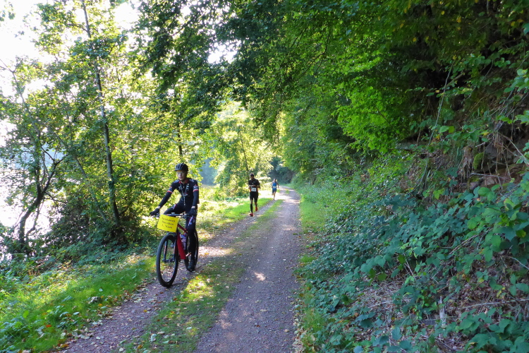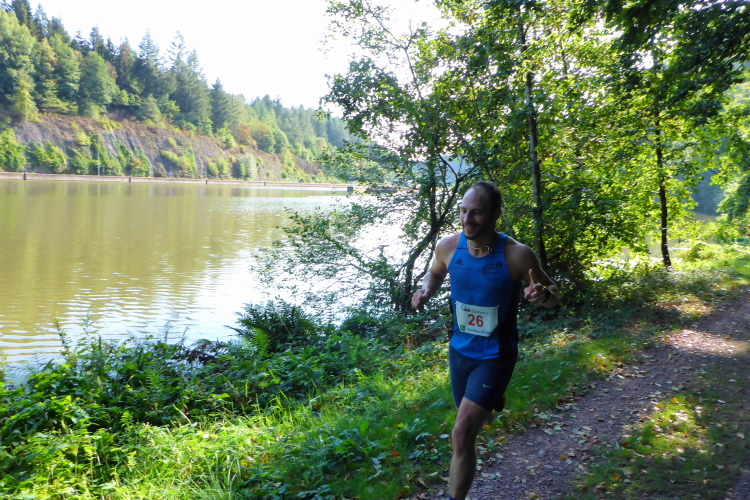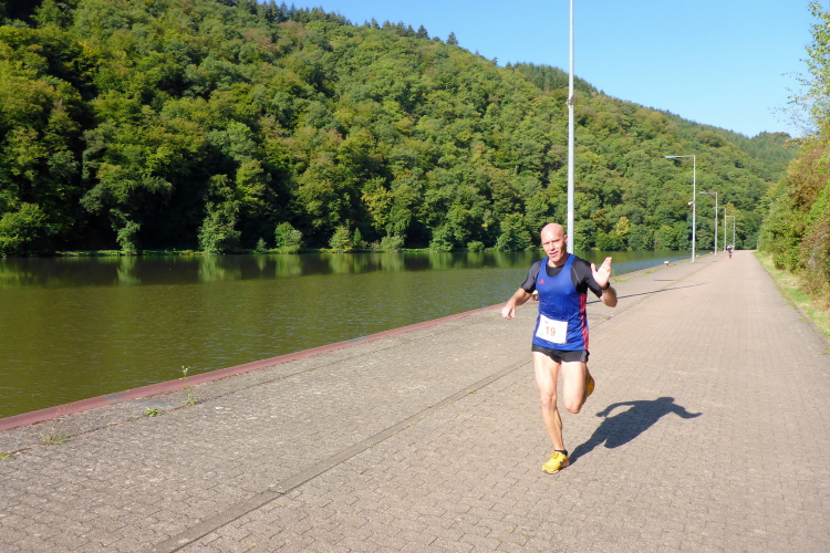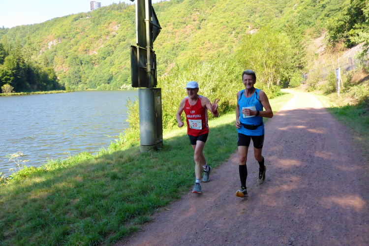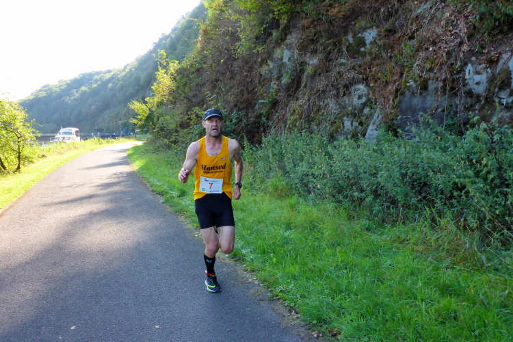 Kurz vor der Staustufe Mettlach kommt mir Martin Schedler entgegen, noch führt er, aber Phillipe Weingarth ist dicht hinter ihm. Dahinter kämpft sich Jörg Hoos nach vorne.