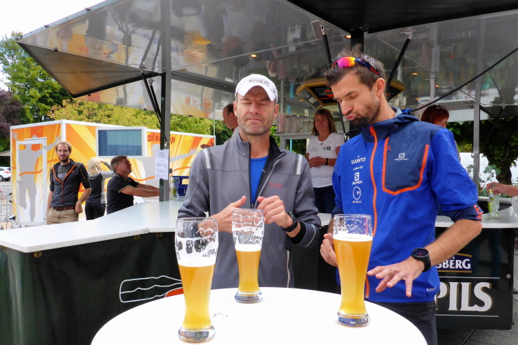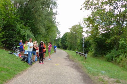 Bei Kilometer 36 kommen wir am Zielgelände vorbei. Ich kann das Bier riechen, Viez nicht. Drei Kilometer geht es weiter flussaufwärts bis zum Wendepunkt. Die letzte Halbmarathonläuferin bewundert lautstark jeden Marathonläufer, obwohl sie sichtlich selbst Probleme hat. Ich finde es gut, dass sie überhaupt angetreten ist. Es ist aber auch mental sehr fordernd, wenn man am Zielgelände vorbeiläuft, um am Wendepunkt kehrt zu machen und wieder zurück zu laufen.